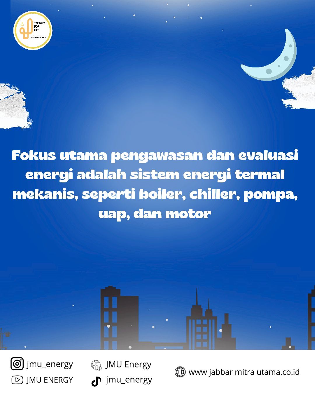 Fokus utama pengawasan dan evaluasi energi adalah sistem energi termal mekanis, seperti boiler, chiller, pompa, uap, dan motor.