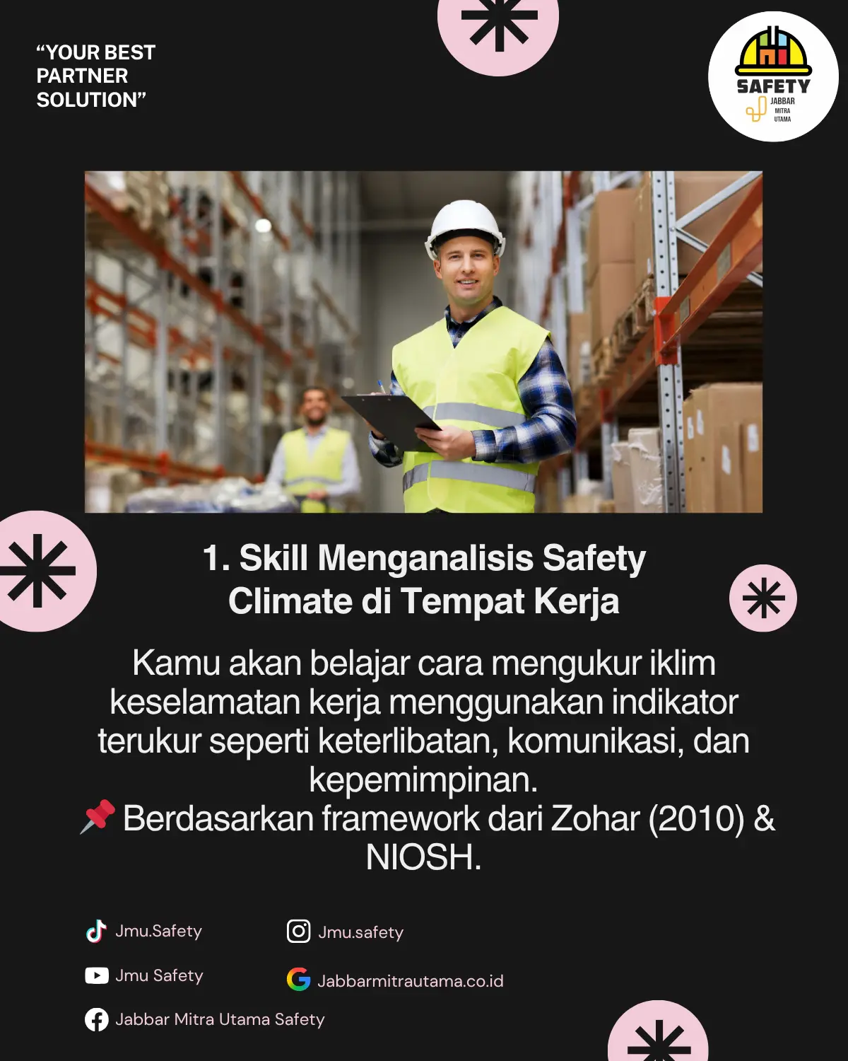 Pelatihan safety climate tidak hanya mengubah mindset, tetapi membekali pekerja dan pimpinan dengan keterampilan nyata. Ketujuh skill ini dapat dijadikan indikator pencapaian pelatihan K3 yang berdampak, baik secara individual maupun organisasi.