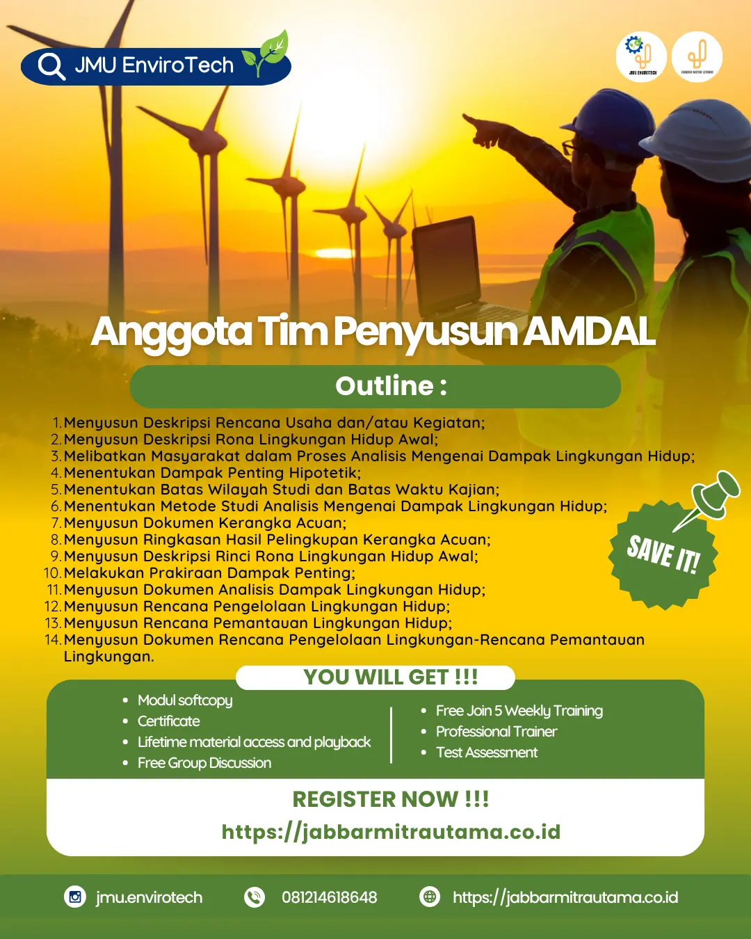 Pelatihan ini dirancang untuk membekali peserta dengan pengetahuan dan keterampilan teknis sebagai Anggota Tim Penyusun AMDAL (Analisis Mengenai Dampak Lingkungan). Pelatihan ini membahas secara lengkap proses penyusunan dokumen AMDAL mulai dari penyusunan deskripsi kegiatan, identifikasi dampak, hingga penyusunan dokumen RKL-RPL.