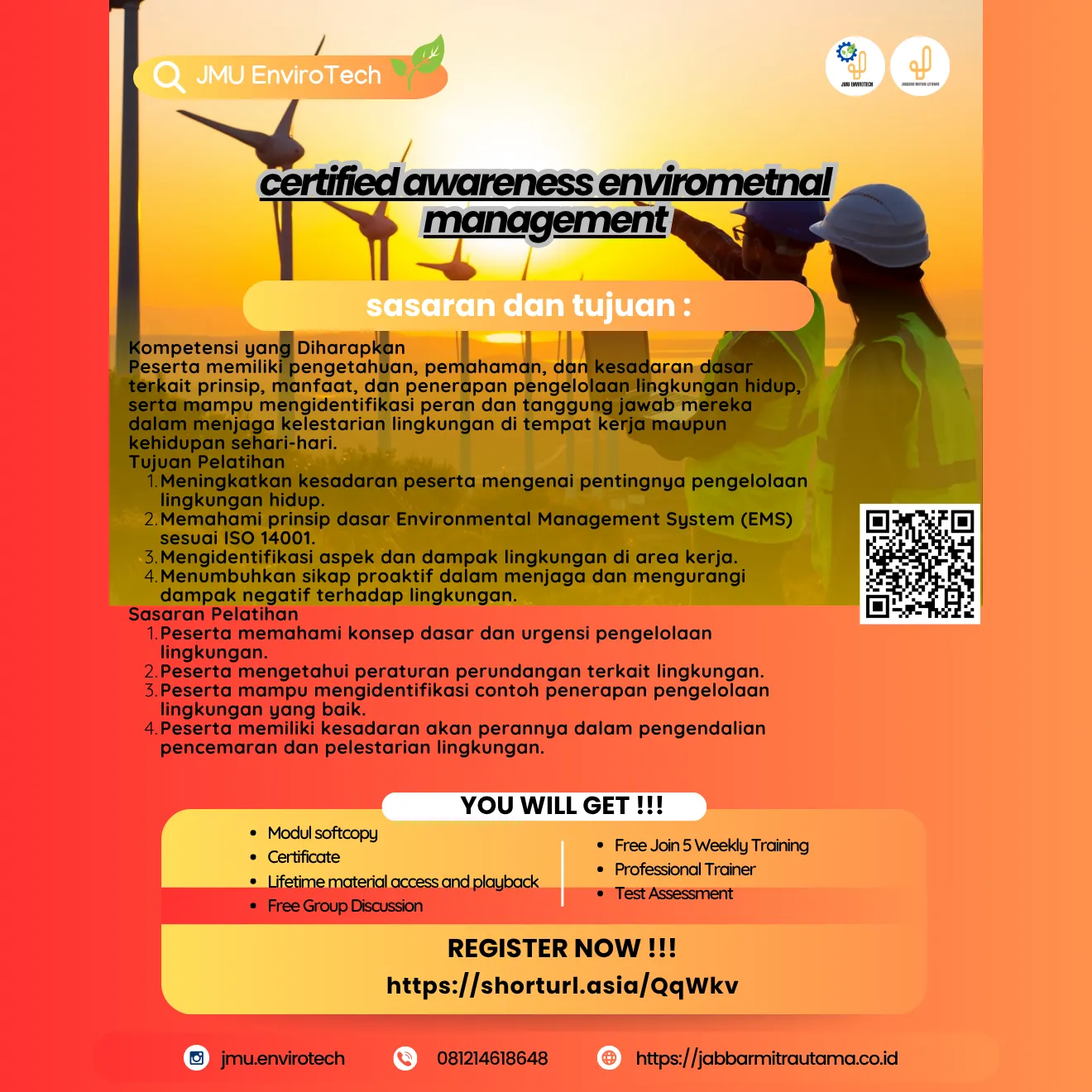 Program ini membekali peserta dengan dasar-dasar konsep lingkungan, prinsip-prinsip manajemen lingkungan, serta strategi penerapan dan pengendalian aspek lingkungan dalam kegiatan operasional organisasi. Dilengkapi dengan materi praktis seperti identifikasi aspek dan dampak lingkungan, PDCA, serta budaya kesadaran lingkungan, pelatihan ini ideal untuk siapa saja yang ingin memperkuat peran dan tanggung jawabnya dalam pengelolaan lingkungan yang berkelanjutan.