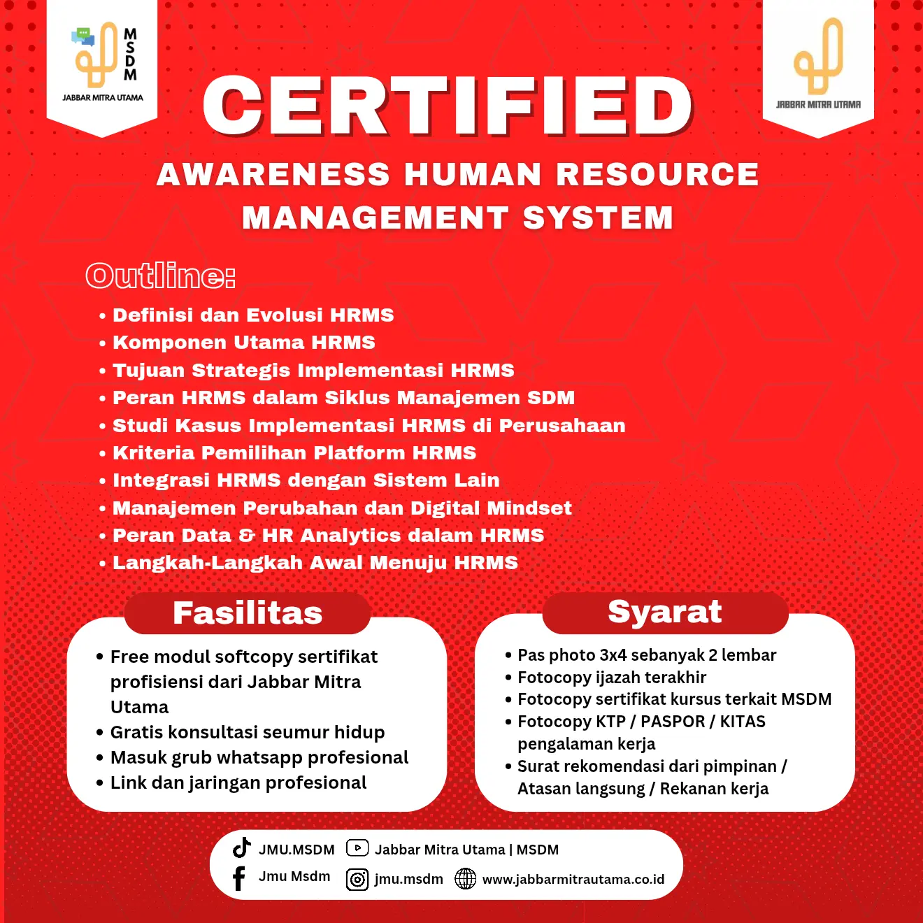 Pelatihan ini dirancang untuk memberikan pemahaman komprehensif tentang konsep, fungsi, dan penerapan Human Resource Management System (HRMS) di lingkungan kerja modern. Peserta akan mempelajari evolusi HRMS, komponen utama yang membentuk sistem ini, serta tujuan strategis implementasinya dalam mendukung manajemen sumber daya manusia yang efektif.