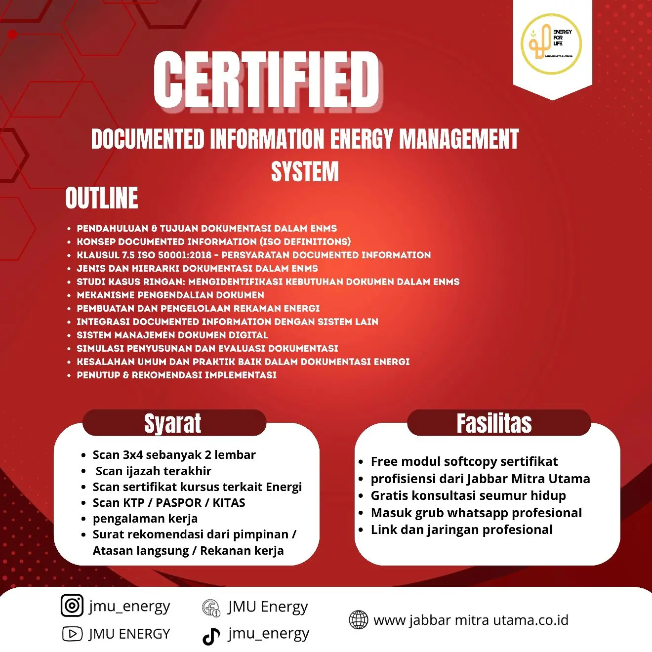 Pelatihan “Certified Documented Information Energy Management System” adalah program e-learning yang dirancang untuk memberikan pemahaman dan keterampilan dalam mengelola informasi terdokumentasi yang menjadi bagian penting dari penerapan Sistem Manajemen Energi (EnMS) berbasis standar ISO 50001:2018.