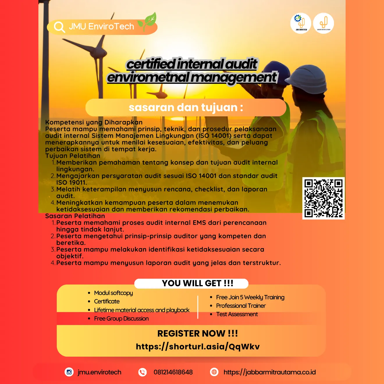 Pelatihan “Internal Audit Environmental Management System” merupakan program e-learning yang dirancang untuk membekali peserta dengan pengetahuan dan keterampilan teknis dalam melakukan audit internal sistem manajemen lingkungan (EMS) berdasarkan standar ISO 14001:2015.