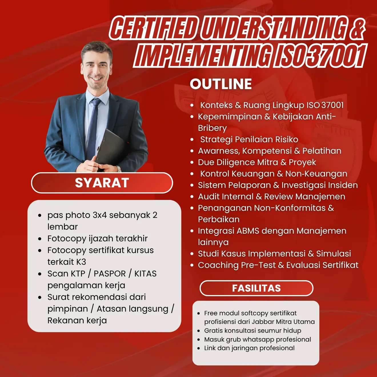 Pelatihan Certified Understanding & Implementing ISO 37001 memberikan pemahaman komprehensif mengenai penerapan Sistem Manajemen Anti-Penyuapan sesuai standar internasional. Peserta akan mempelajari konteks dan ruang lingkup ISO 37001, kepemimpinan serta kebijakan anti-penyuapan, hingga strategi penilaian risiko. Materi juga mencakup due diligence pihak ketiga, pengendalian keuangan dan non-keuangan, manajemen audit internal, serta penanganan non-konformitas. Selain itu, peserta akan dilatih untuk mengintegrasikan ISO 37001 dengan manajemen lainnya, mempraktikkan studi kasus, serta menjalani coaching pre-test dan evaluasi sertifikasi.