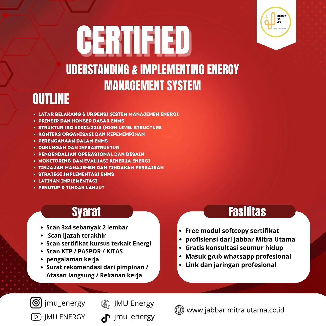 Pelatihan “Certified Understanding & Implementing Energy Management System” adalah program e-learning komprehensif yang ditujukan bagi individu maupun organisasi yang ingin memahami dan menerapkan Sistem Manajemen Energi (EnMS) berdasarkan standar ISO 50001:2018.