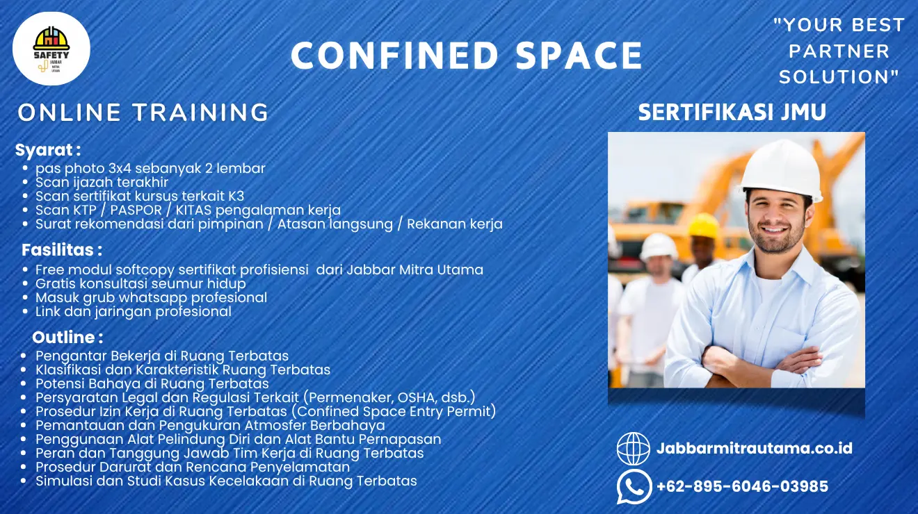 Pelatihan online "Confined Space" dirancang untuk memberikan pemahaman komprehensif tentang keselamatan dan kesehatan kerja (K3) saat bekerja di ruang terbatas. Peserta akan mempelajari klasifikasi ruang terbatas, potensi bahaya, regulasi terkait, serta prosedur kerja yang aman sesuai standar Permenaker dan OSHA. Pelatihan ini dilengkapi dengan studi kasus nyata dan simulasi untuk mempersiapkan peserta menghadapi situasi darurat.