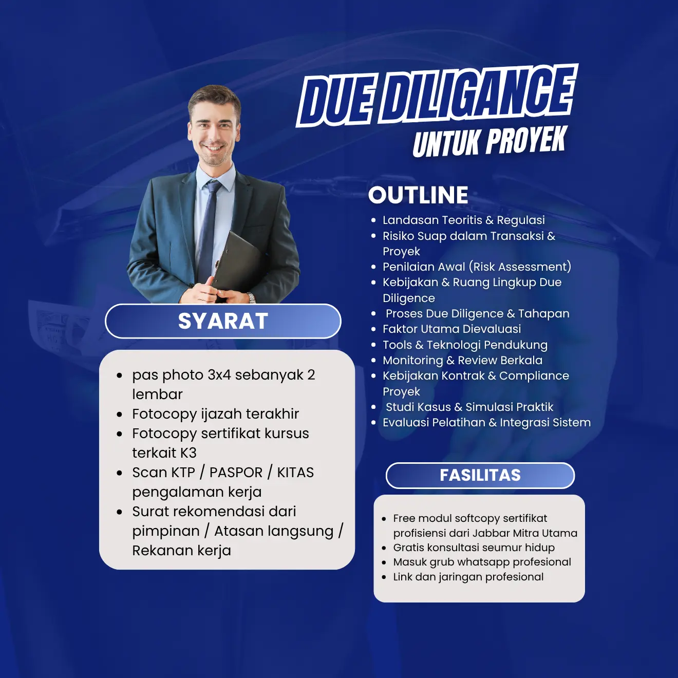 Pelatihan ini dirancang untuk memberikan pemahaman menyeluruh tentang penerapan due diligence dalam konteks proyek, baik dari sisi transaksi maupun eksekusi. Peserta akan mempelajari aspek teoritis dan regulatif, termasuk identifikasi risiko sejak dini serta ruang lingkup kebijakan yang berlaku dalam proyek.