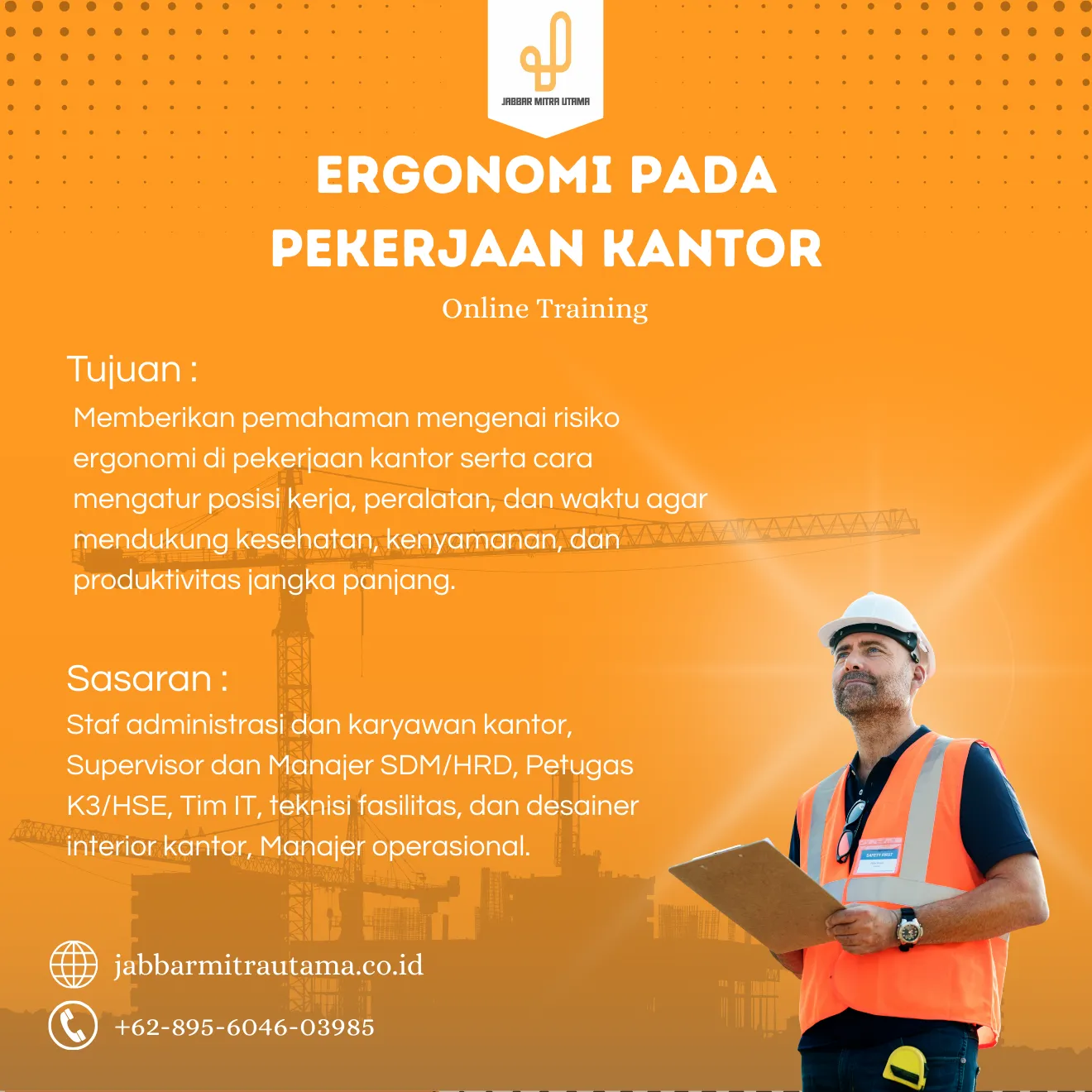 Pekerjaan kantor yang melibatkan posisi duduk dalam waktu lama, penggunaan komputer, serta pengaturan ruang kerja dapat menimbulkan risiko ergonomi jika tidak dikelola dengan baik. Pelatihan ini dirancang untuk memberikan pemahaman mengenai cara mengatur posisi kerja, peralatan, dan waktu kerja agar mendukung kesehatan, kenyamanan, dan produktivitas jangka panjang.