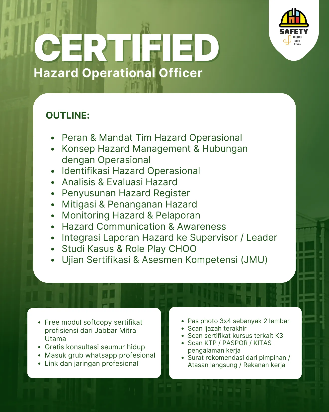 - Mempersiapkan peserta untuk mengikuti ujian sertifikasi dan asesmen kompetensi sebagai Hazard Operational Officer bersertifikat.
