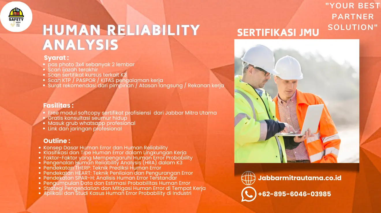 Pelatihan online Human Reliability Analysis (HRA) dirancang untuk memberikan pemahaman mendalam tentang analisis keandalan manusia dalam sistem kerja, dengan fokus pada identifikasi, prediksi, dan mitigasi kesalahan manusia. Program ini menggabungkan pendekatan teoritis dan praktis melalui teknik-teknik mutakhir untuk meningkatkan keandalan sumber daya manusia di berbagai industri, khususnya yang berisiko tinggi.