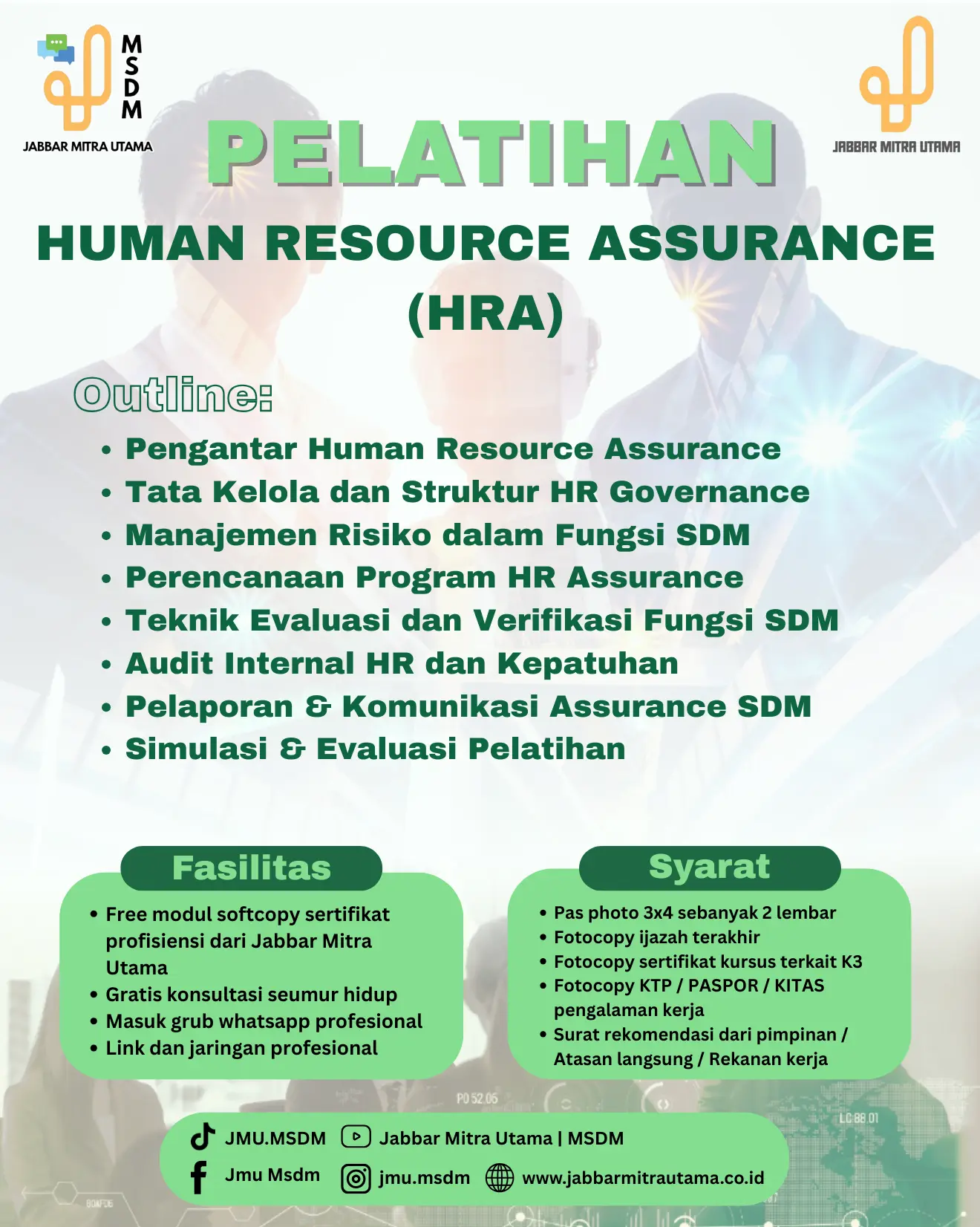 Pelatihan Human Resource Assurance (HRA) ini dirancang untuk membekali peserta dengan pemahaman mendalam mengenai tata kelola, manajemen risiko, dan pengawasan fungsi SDM dalam organisasi. Fokus utama pelatihan adalah memastikan bahwa seluruh proses dan kebijakan SDM berjalan secara efektif, efisien, dan sesuai dengan prinsip kepatuhan (compliance) dan tata kelola yang baik (good governance).