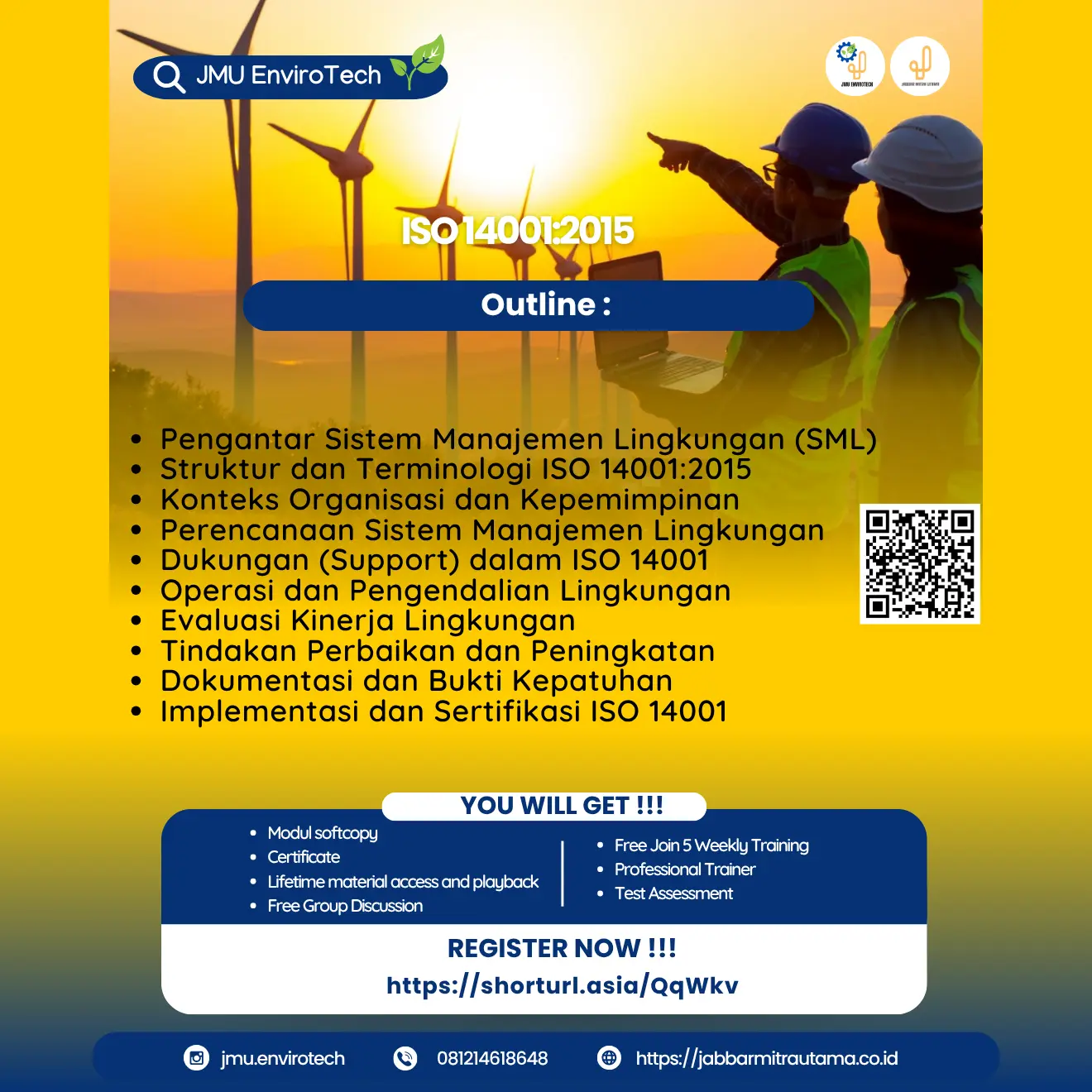 Peserta juga akan dibekali dengan teknik evaluasi kinerja lingkungan, perbaikan berkelanjutan, serta pemahaman tentang dokumentasi kepatuhan yang dibutuhkan dalam proses sertifikasi ISO 14001.