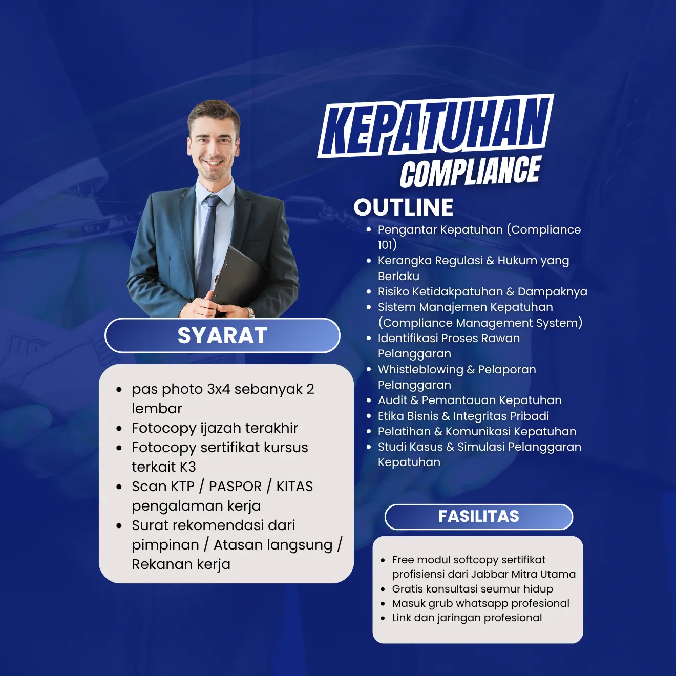 - Menerapkan materi melalui studi kasus dan simulasi pelanggaran kepatuhan.