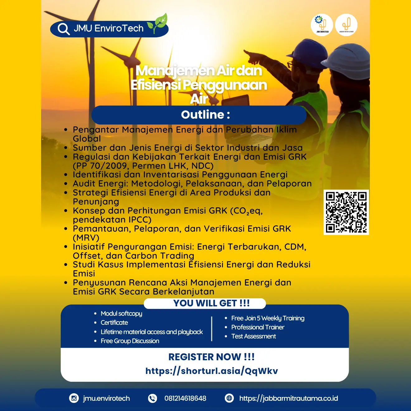 Pelatihan ini membekali peserta dengan keterampilan dalam mengelola energi secara efisien serta mengidentifikasi dan menghitung emisi Gas Rumah Kaca (GRK). Fokus diberikan pada strategi pengurangan emisi, pemantauan energi, dan penerapan kebijakan keberlanjutan di perusahaan.