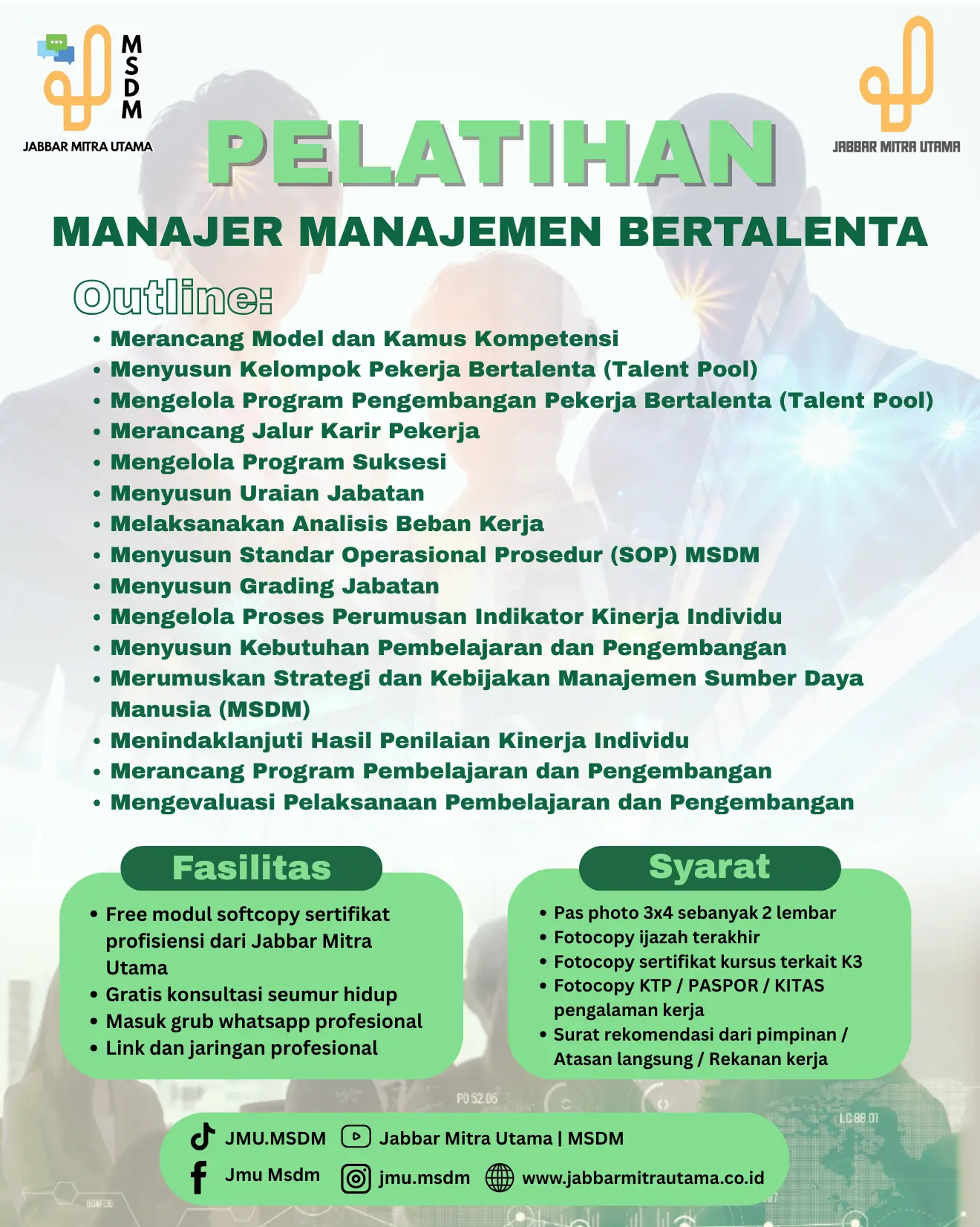 Pelatihan Manajer Manajemen Bertalenta dirancang untuk membekali peserta dengan pengetahuan dan keterampilan dalam mengelola serta mengembangkan sumber daya manusia yang bertalenta di organisasi. Melalui program ini, peserta akan memahami cara menyusun model dan kamus kompetensi, membentuk serta mengelola talent pool, hingga mengimplementasikan strategi pengembangan karier dan manajemen suksesi.