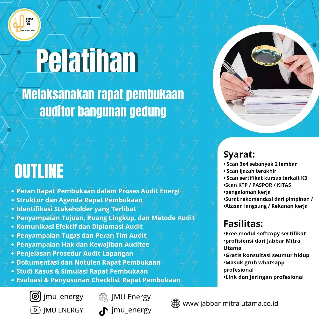 Pelatihan ini dirancang khusus bagi para auditor energi yang akan melaksanakan audit pada sektor bangunan gedung. Fokus pelatihan adalah membekali peserta dengan kemampuan menyelenggarakan rapat pembukaan secara sistematis, efektif, dan sesuai standar audit energi.