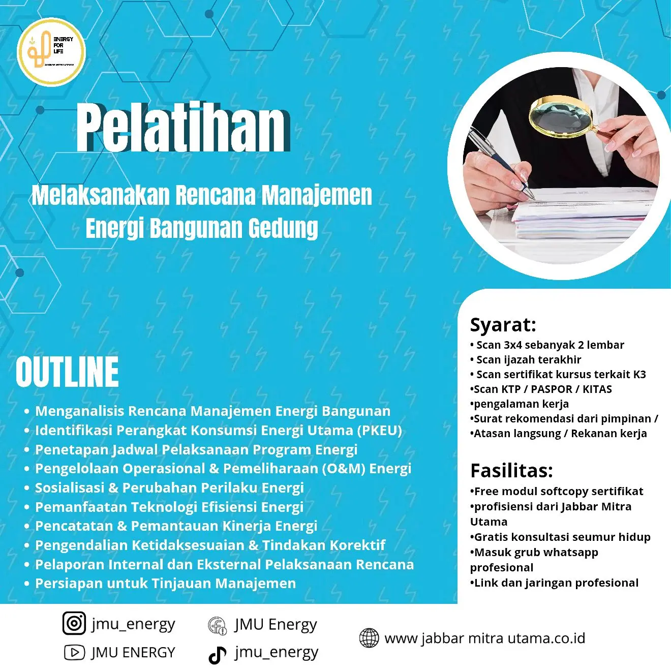 Pelatihan ini dirancang untuk meningkatkan kompetensi peserta dalam merencanakan dan melaksanakan manajemen energi di bangunan gedung. Peserta akan dibekali dengan pengetahuan dan keterampilan teknis dalam mengidentifikasi potensi penghematan energi, menyusun program manajemen energi, serta melakukan evaluasi terhadap pelaksanaannya.
