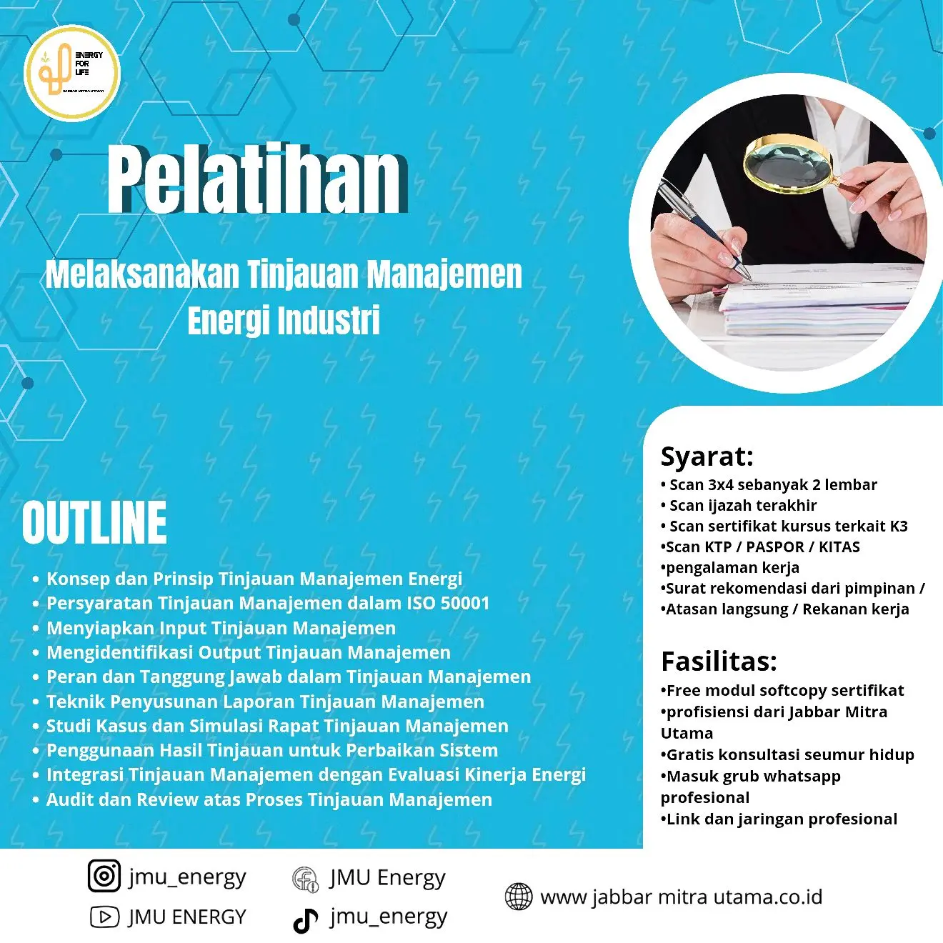 Pelatihan ini dirancang untuk membekali peserta dengan pemahaman dan keterampilan dalam melaksanakan proses tinjauan manajemen energi di sektor industri, sesuai dengan standar ISO 50001. Peserta akan mempelajari langkah-langkah strategis mulai dari persiapan, identifikasi input dan output, hingga evaluasi kinerja energi untuk perbaikan berkelanjutan.