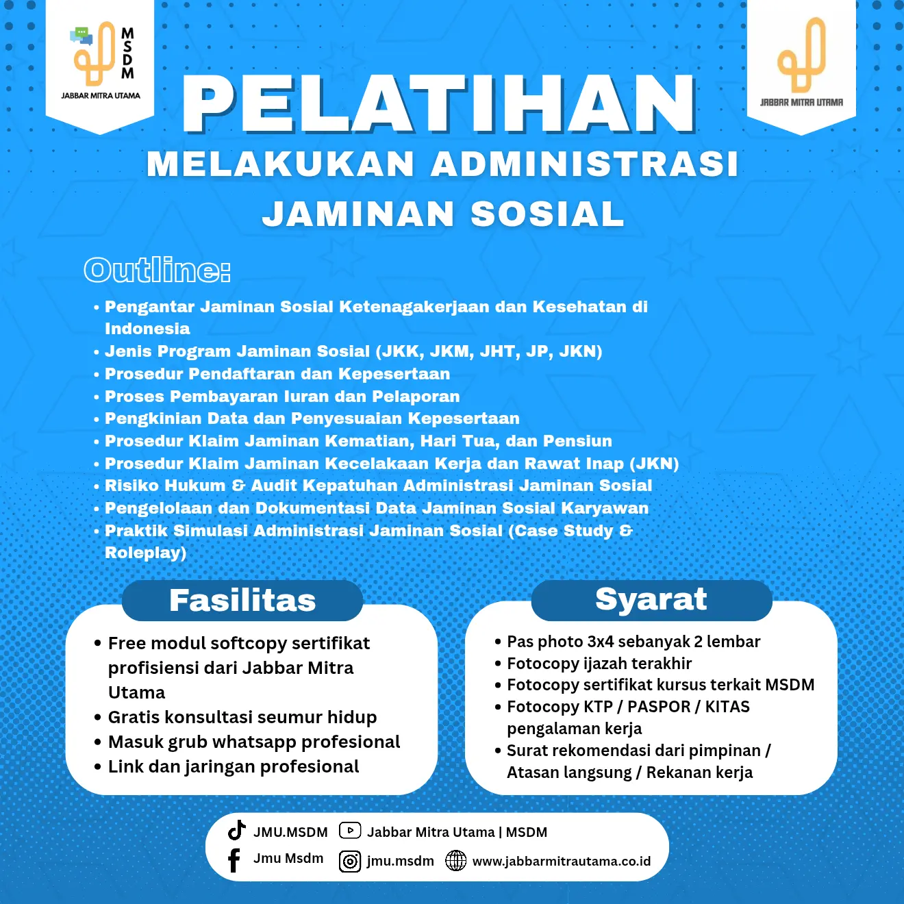 Pelatihan ini dirancang untuk membekali peserta dengan pengetahuan dan keterampilan dalam mengelola administrasi jaminan sosial ketenagakerjaan dan kesehatan di lingkungan kerja. Materi pelatihan mencakup berbagai aspek penting dari regulasi, jenis program, proses pendaftaran, hingga pemanfaatan dan pelaporan jaminan sosial sesuai ketentuan yang berlaku di Indonesia.