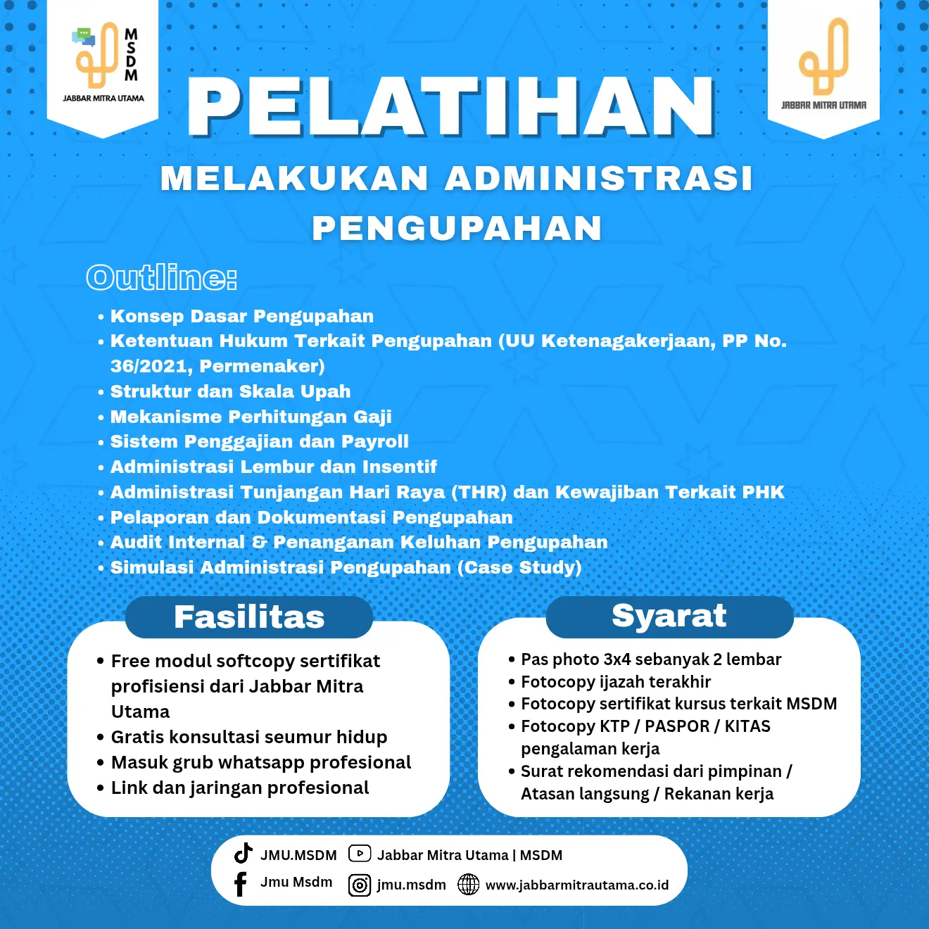 Pelatihan ini disusun untuk membekali peserta dengan pengetahuan dan keterampilan administratif yang dibutuhkan dalam pengelolaan sistem pengupahan di lingkungan kerja. Pelatihan ini mencakup seluruh aspek teknis dan regulasi terkini terkait pengupahan, dengan pendekatan praktis agar dapat langsung diterapkan dalam aktivitas profesional.