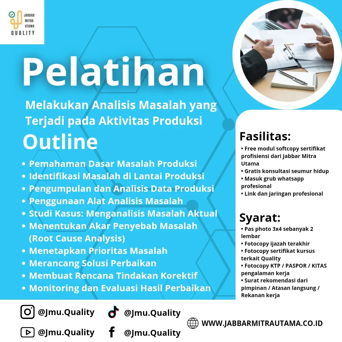 Pelatihan "Melakukan Analisis Masalah yang Terjadi pada Aktivitas Produksi" dirancang untuk membekali peserta dengan kemampuan mengidentifikasi, menganalisis, dan menyelesaikan masalah yang muncul di area produksi secara efektif. Peserta akan mempelajari langkah-langkah sistematis mulai dari pemahaman dasar permasalahan produksi, identifikasi masalah di lantai produksi, hingga teknik pengumpulan dan analisis data yang relevan.