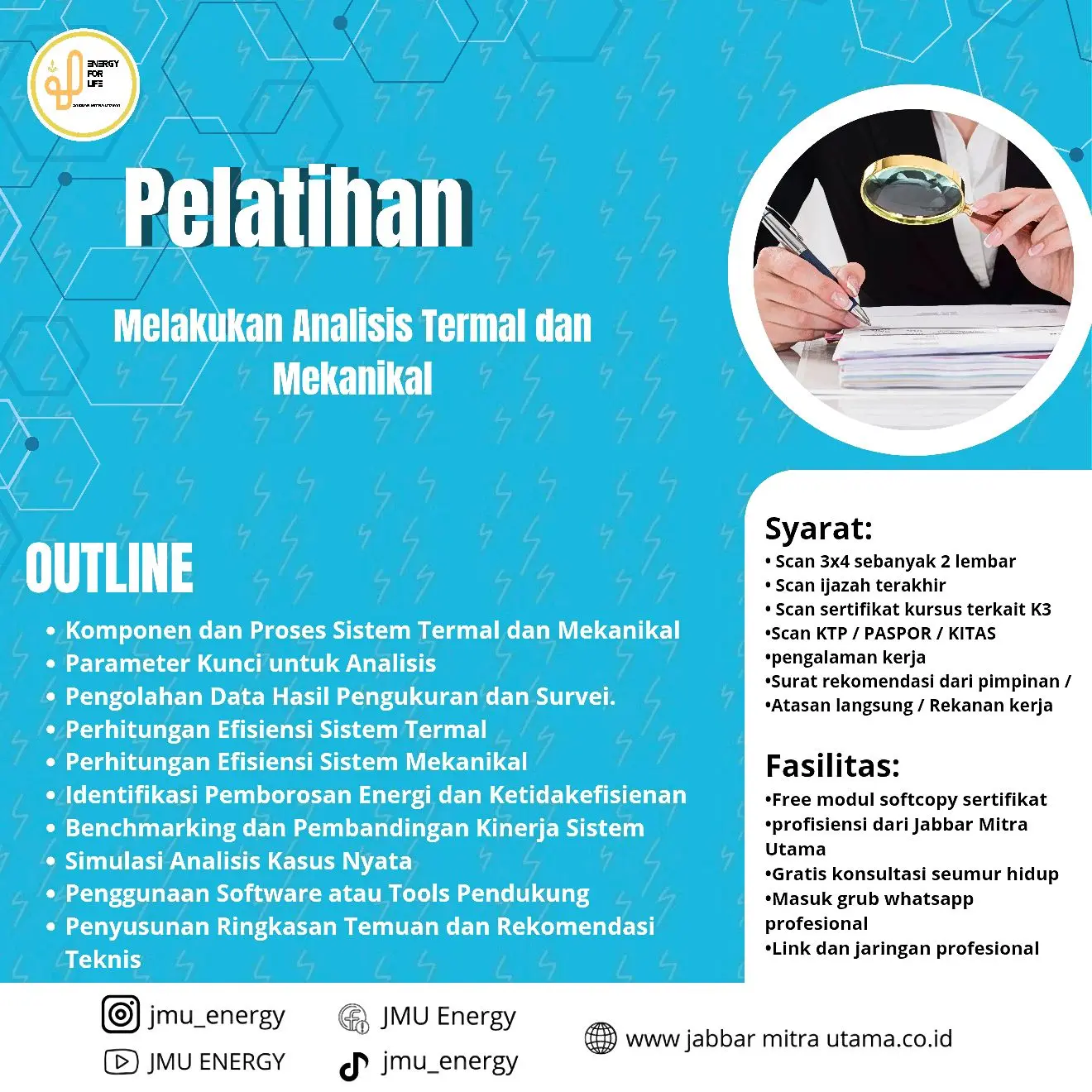 Pelatihan ini dirancang untuk meningkatkan kemampuan teknis peserta dalam melakukan analisis sistem termal dan mekanikal sebagai bagian dari pengelolaan energi yang efisien. Peserta akan mempelajari cara mengidentifikasi komponen sistem, menghitung efisiensi, serta menggunakan perangkat lunak pendukung dalam proses analisis energi.
