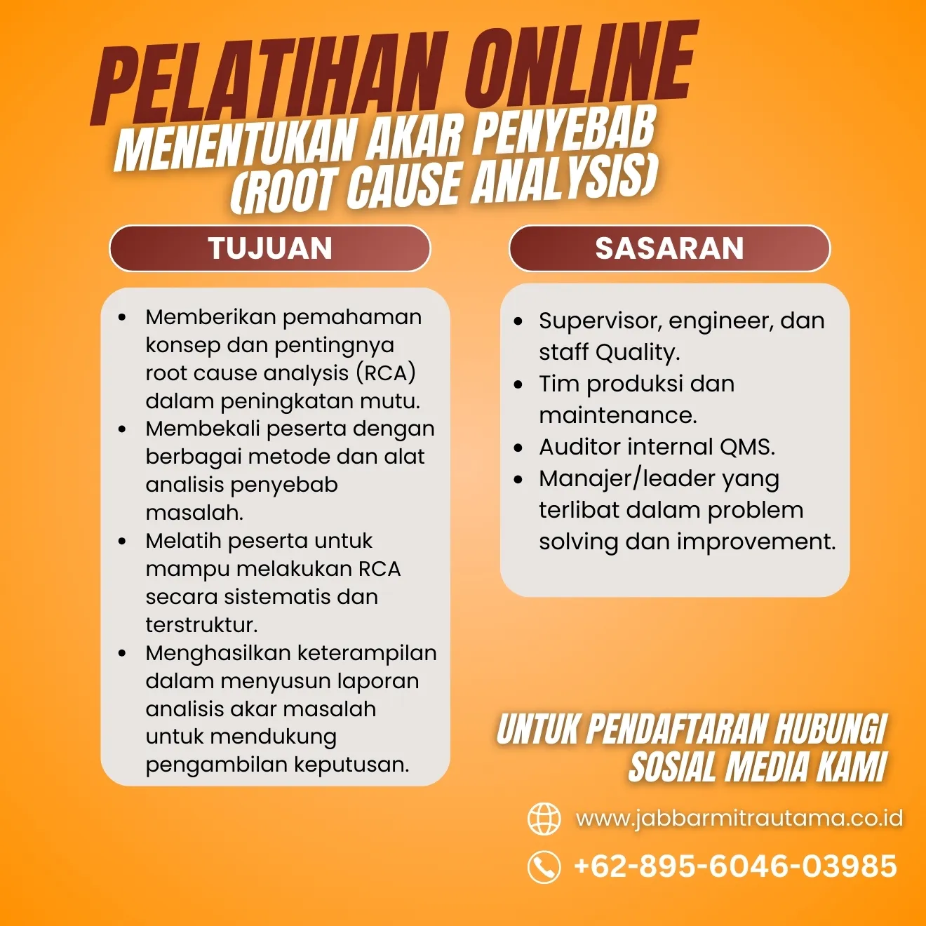 Pelatihan ini juga melatih peserta agar dapat melakukan RCA dengan sistematis dan terstruktur, serta mengembangkan keterampilan dalam menyusun laporan analisis yang dapat mendukung proses pengambilan keputusan di organisasi.