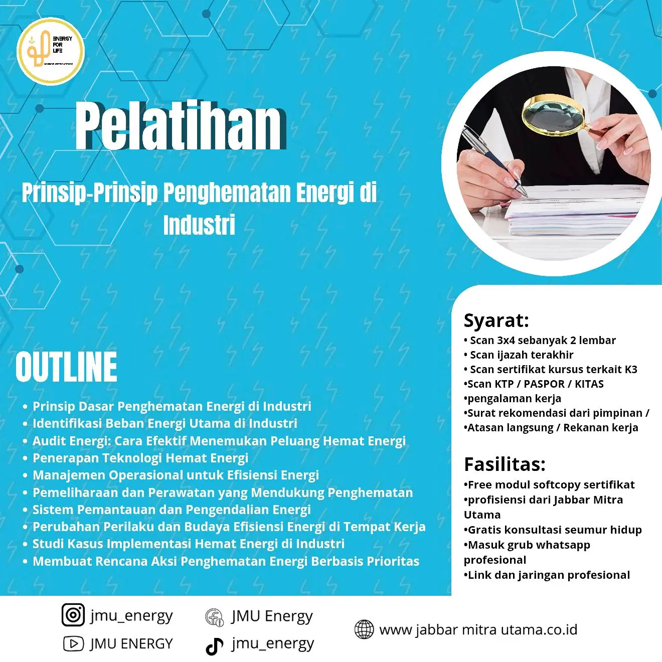 Pelatihan ini dirancang untuk memberikan pengetahuan dan keterampilan praktis bagi para profesional industri dalam mengidentifikasi, merencanakan, dan menerapkan langkah-langkah penghematan energi yang efektif. Materi pelatihan mencakup prinsip dasar efisiensi energi, teknik audit energi, penerapan teknologi hemat energi, serta strategi manajemen operasional yang mendukung efisiensi berkelanjutan.