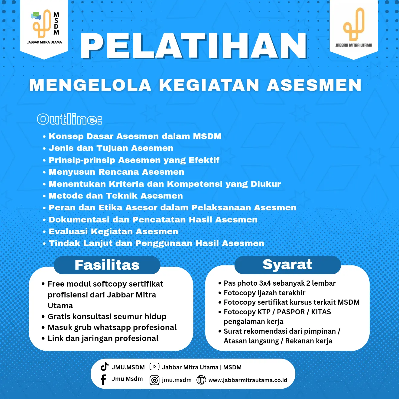 Pelatihan ini dirancang untuk meningkatkan kompetensi peserta dalam merancang, melaksanakan, dan mengevaluasi kegiatan asesmen secara profesional dan sistematis. Asesmen merupakan alat penting dalam proses manajemen SDM untuk mengukur kompetensi, kinerja, serta potensi karyawan secara objektif.