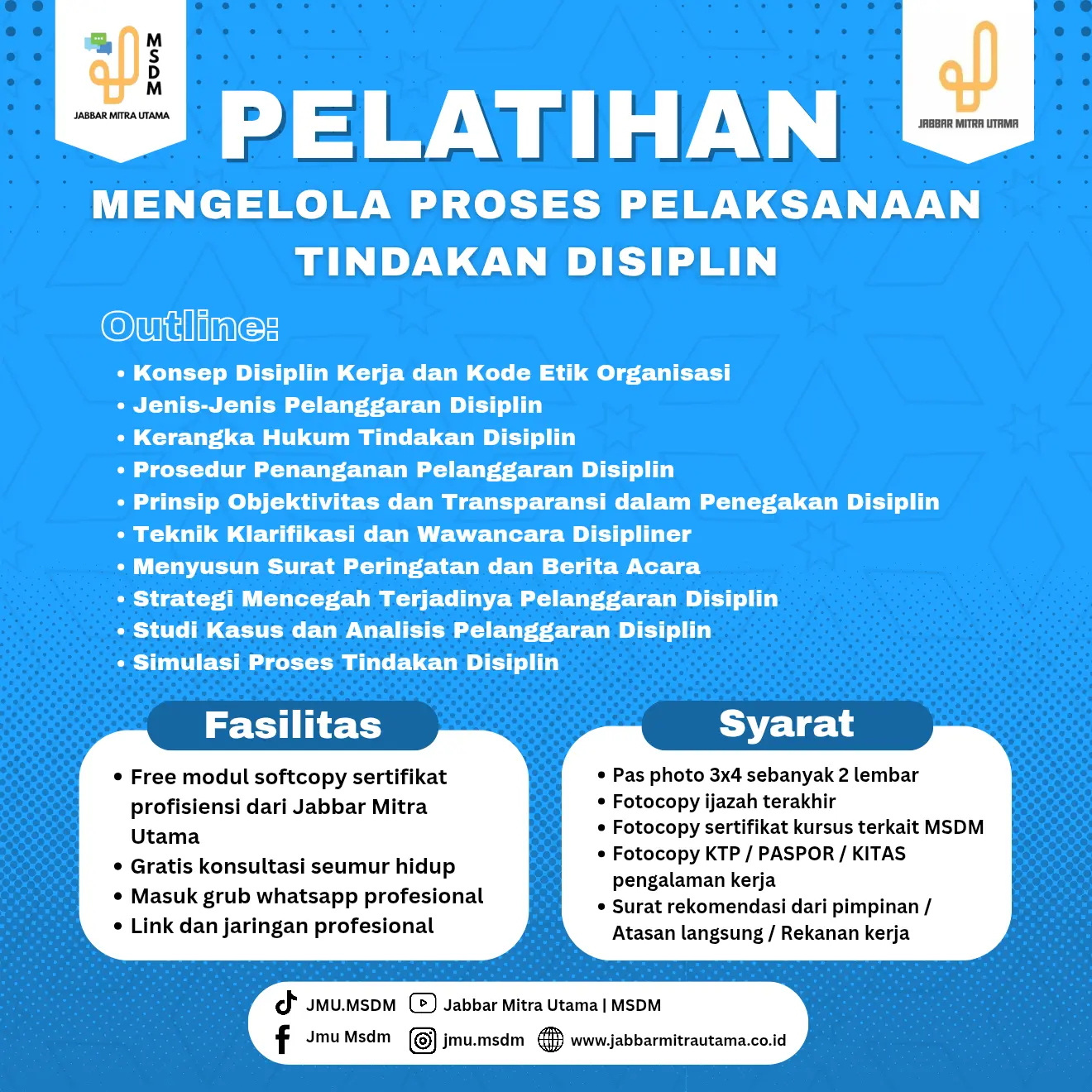 Pelatihan ini dirancang untuk membekali peserta dengan pengetahuan dan keterampilan dalam mengelola proses pelaksanaan tindakan disiplin di lingkungan kerja secara profesional, adil, dan sesuai peraturan. Peserta akan mempelajari konsep disiplin kerja, kode etik organisasi, serta berbagai jenis pelanggaran disiplin yang umum terjadi.