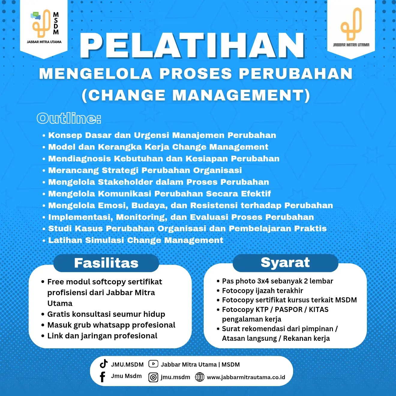 Pelatihan ini dirancang untuk membekali peserta dengan pengetahuan dan keterampilan dalam mengelola proses perubahan organisasi secara efektif. Materi mencakup konsep dasar manajemen perubahan, analisis dampak perubahan, strategi komunikasi, manajemen resistensi, serta implementasi rencana perubahan yang berkelanjutan. Peserta akan mempelajari teknik untuk memimpin dan memotivasi tim agar dapat beradaptasi serta mendukung keberhasilan perubahan di lingkungan kerja.