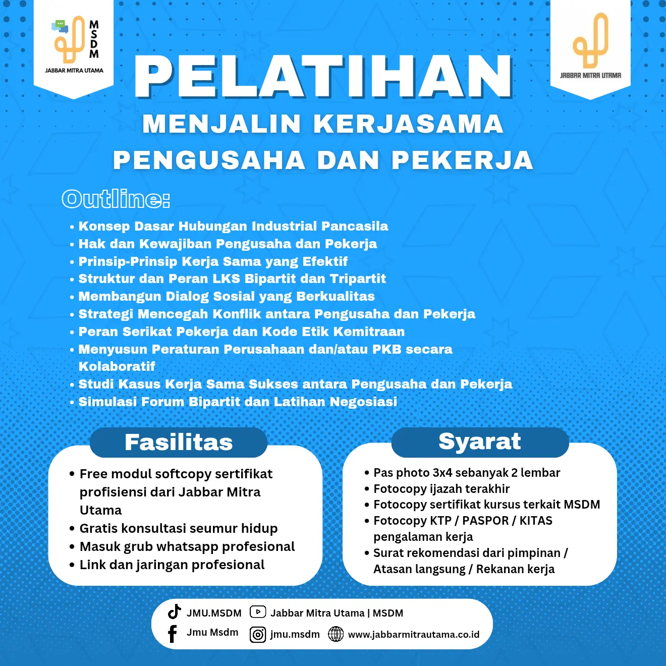 Pelatihan ini dirancang untuk membantu peserta memahami prinsip, strategi, dan teknik membangun hubungan kerja yang harmonis antara pengusaha dan pekerja. Materi mencakup komunikasi efektif, penyelesaian masalah bersama, serta pengelolaan perbedaan kepentingan secara konstruktif. Peserta akan mempelajari peran masing-masing pihak dalam menciptakan lingkungan kerja yang kondusif, produktif, dan berlandaskan saling menghormati, serta memahami kerangka hukum dan regulasi ketenagakerjaan yang berlaku.