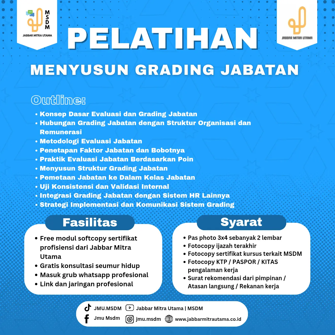 Pelatihan ini dirancang untuk memberikan pemahaman mendalam mengenai konsep, metode, dan proses penyusunan grading jabatan dalam organisasi. Peserta akan mempelajari teknik evaluasi jabatan berdasarkan tanggung jawab, kompleksitas pekerjaan, serta kontribusi terhadap tujuan perusahaan. Dengan memahami sistem grading jabatan, peserta dapat membantu menciptakan struktur gaji yang adil, transparan, dan kompetitif, sekaligus mendukung pengelolaan karier dan pengembangan karyawan.