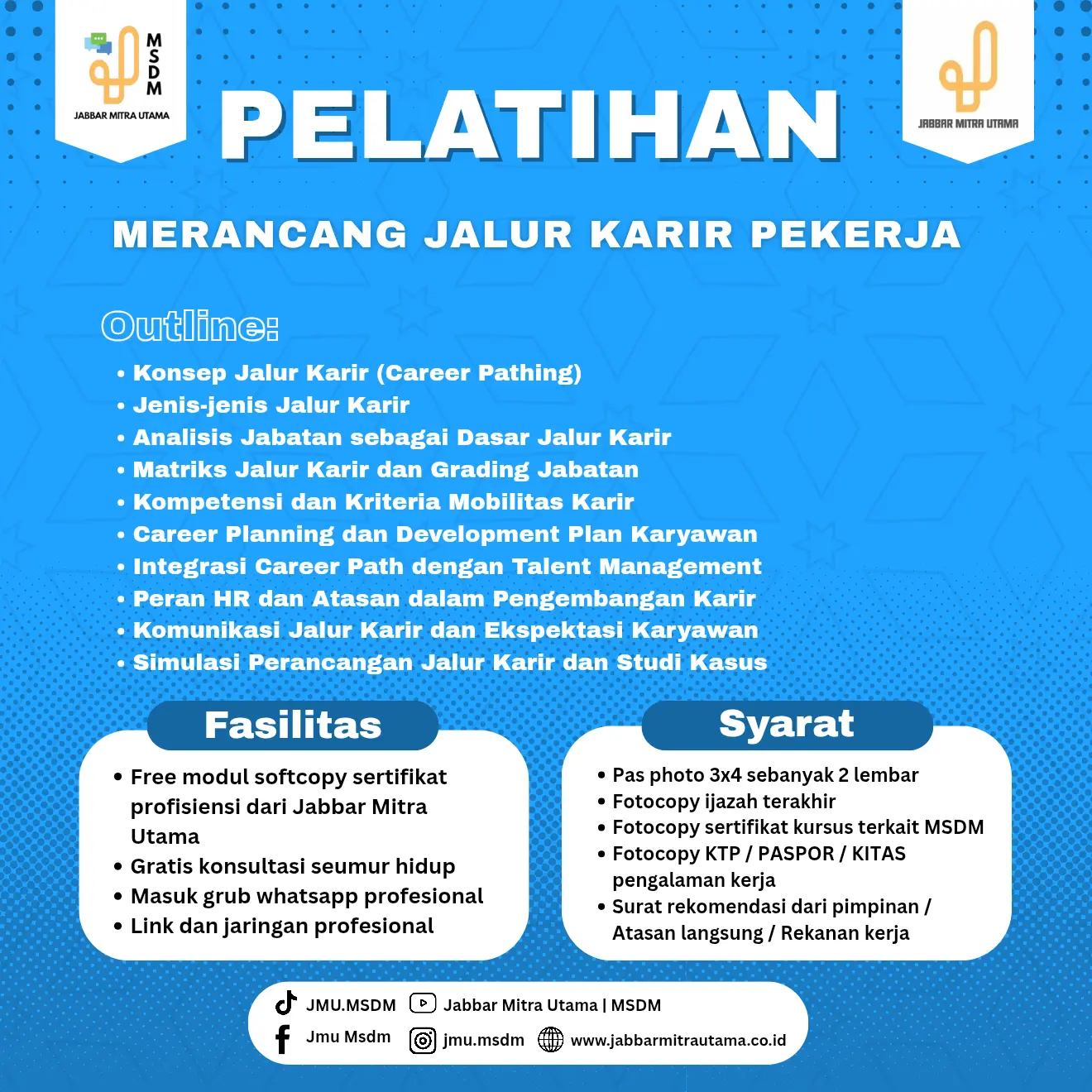 Pelatihan ini bertujuan untuk membekali peserta dengan keterampilan dalam menyusun jalur karir yang strategis dan sistematis bagi pekerja di organisasi. Dengan memahami konsep career pathing, peserta akan mampu merancang struktur pengembangan karir yang mendukung peningkatan kinerja, retensi, dan motivasi karyawan.
