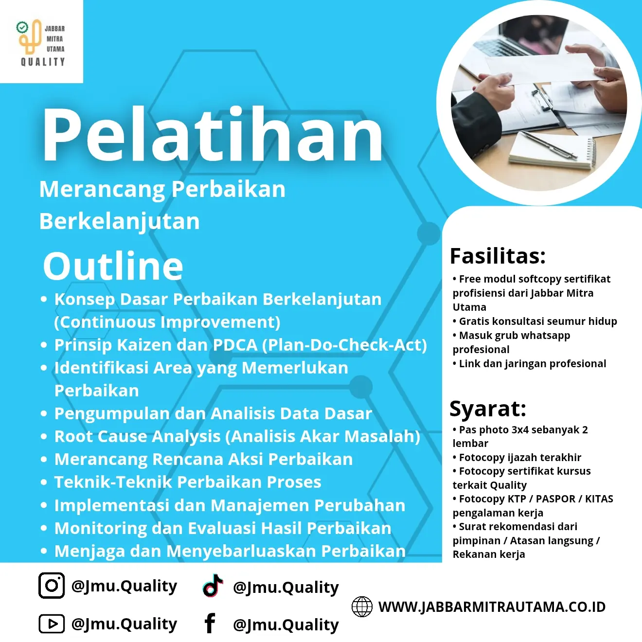 Materi pelatihan mencakup teknik mengidentifikasi area yang membutuhkan perbaikan, pengumpulan serta analisis data dasar, dan penggunaan metode Root Cause Analysis (Analisis Akar Masalah) untuk menemukan sumber masalah secara tepat. Peserta juga akan dilatih menyusun rencana aksi perbaikan, menguasai teknik-teknik perbaikan proses, serta menerapkan manajemen perubahan secara efektif.