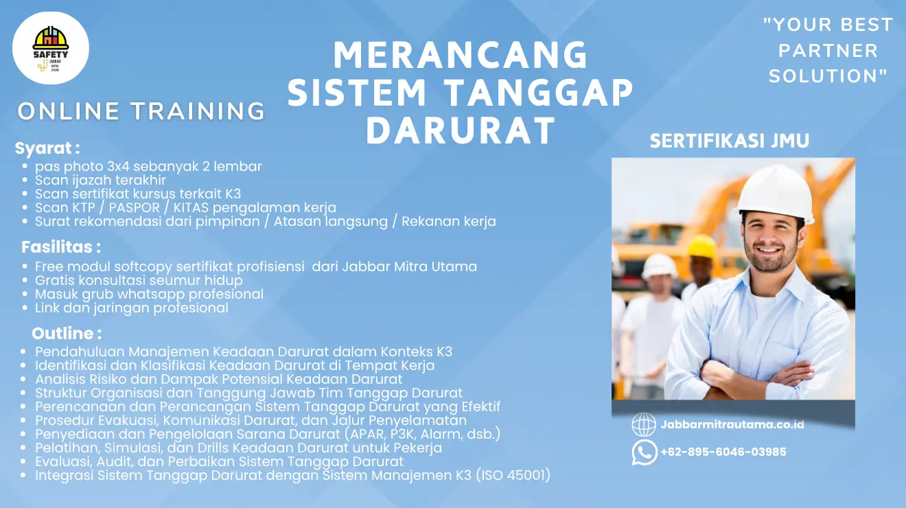 Selain itu, pelatihan ini juga membekali peserta dengan keterampilan menyusun prosedur tanggap darurat, melakukan koordinasi dan komunikasi saat krisis, serta melakukan evaluasi efektivitas sistem tanggap darurat yang telah diterapkan. Melalui studi kasus dan simulasi, peserta akan mendapatkan pengalaman praktis dalam merancang sistem tanggap darurat yang terintegrasi dengan standar manajemen K3 (ISO 45001).