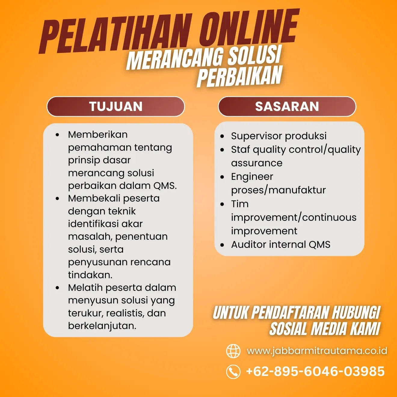 - Membekali peserta dengan keterampilan analisis masalah, mulai dari identifikasi akar penyebab, pemilihan solusi yang sesuai, hingga penyusunan rencana tindak lanjut yang terarah.