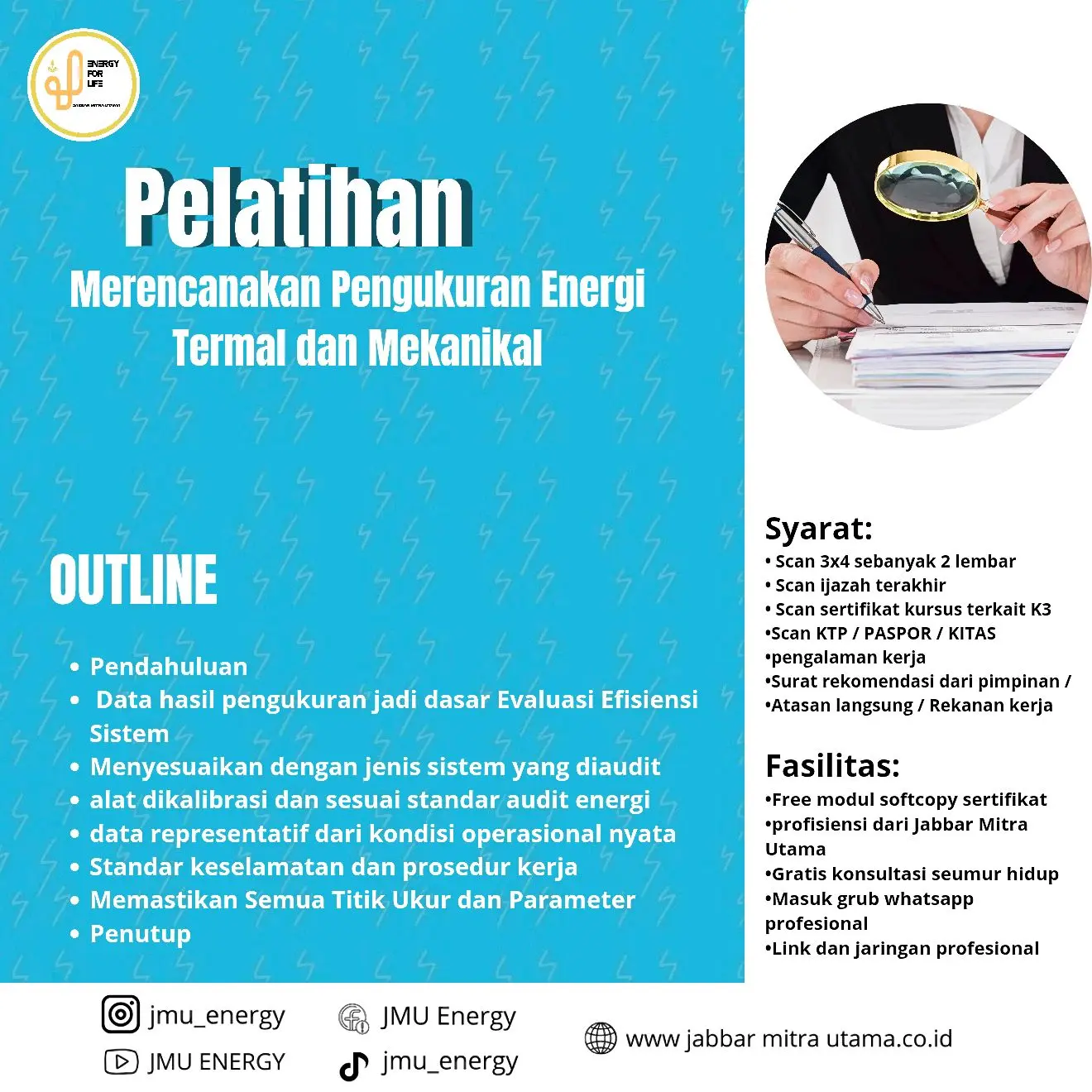 Pelatihan ini sangat cocok untuk para profesional di bidang energi, teknisi audit, manajer operasional, serta pihak yang terlibat dalam efisiensi dan manajemen energi.
