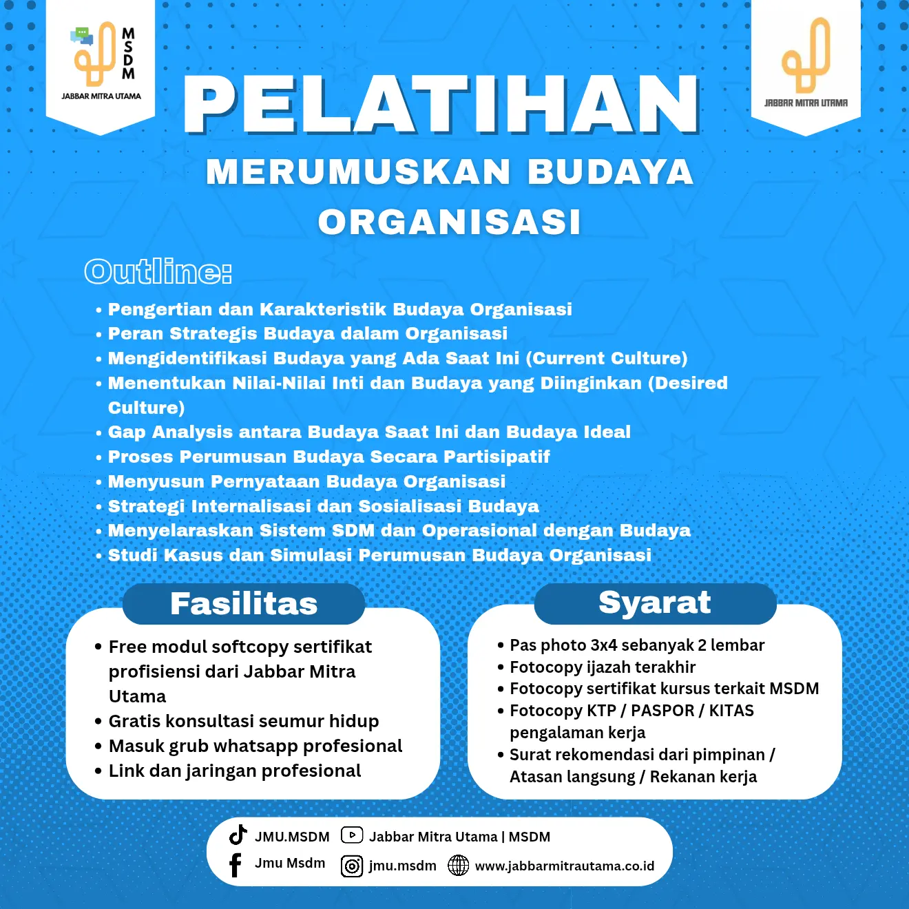 Pelatihan ini dirancang untuk membekali peserta dengan pengetahuan dan keterampilan dalam merumuskan budaya organisasi yang kuat, relevan, dan mendukung pencapaian strategi bisnis. Peserta akan mempelajari bagaimana mengidentifikasi budaya organisasi saat ini (current culture), serta menentukan budaya yang diinginkan (desired culture) melalui pendekatan berbasis nilai-nilai inti organisasi.