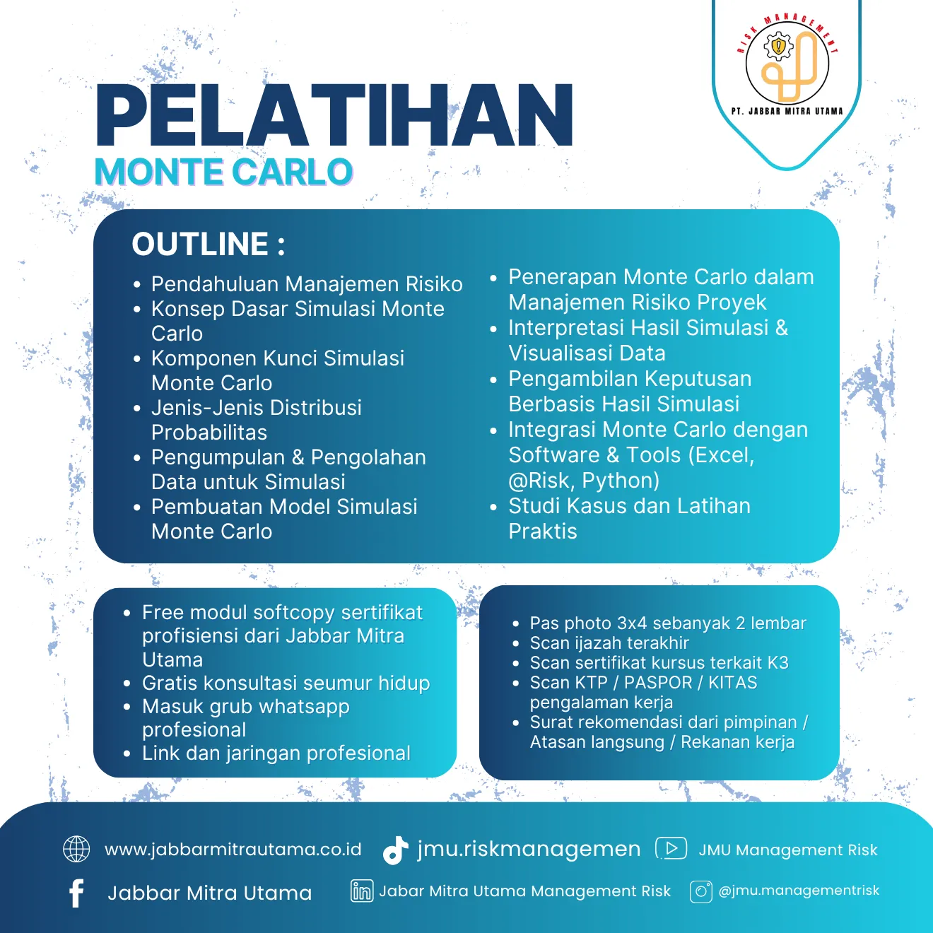 Pelatihan Monte Carlo ini dirancang untuk membekali peserta dengan pemahaman komprehensif tentang manajemen risiko melalui pendekatan simulasi Monte Carlo. Peserta akan mempelajari mulai dari konsep dasar, komponen kunci, hingga penerapan metode ini untuk memprediksi, menganalisis, dan mengoptimalkan pengambilan keputusan berbasis data. Materi akan mencakup pendahuluan manajemen risiko, distribusi probabilitas, analisis data, serta pembuatan dan penggunaan model simulasi. Selain itu, peserta akan belajar bagaimana mengintegrasikan Monte Carlo dengan perangkat lunak seperti Excel, @Risk, dan Python untuk mengolah dan memvisualisasikan hasil analisis. Pelatihan ini juga dilengkapi dengan studi kasus dan latihan praktis yang relevan dengan kebutuhan industri.