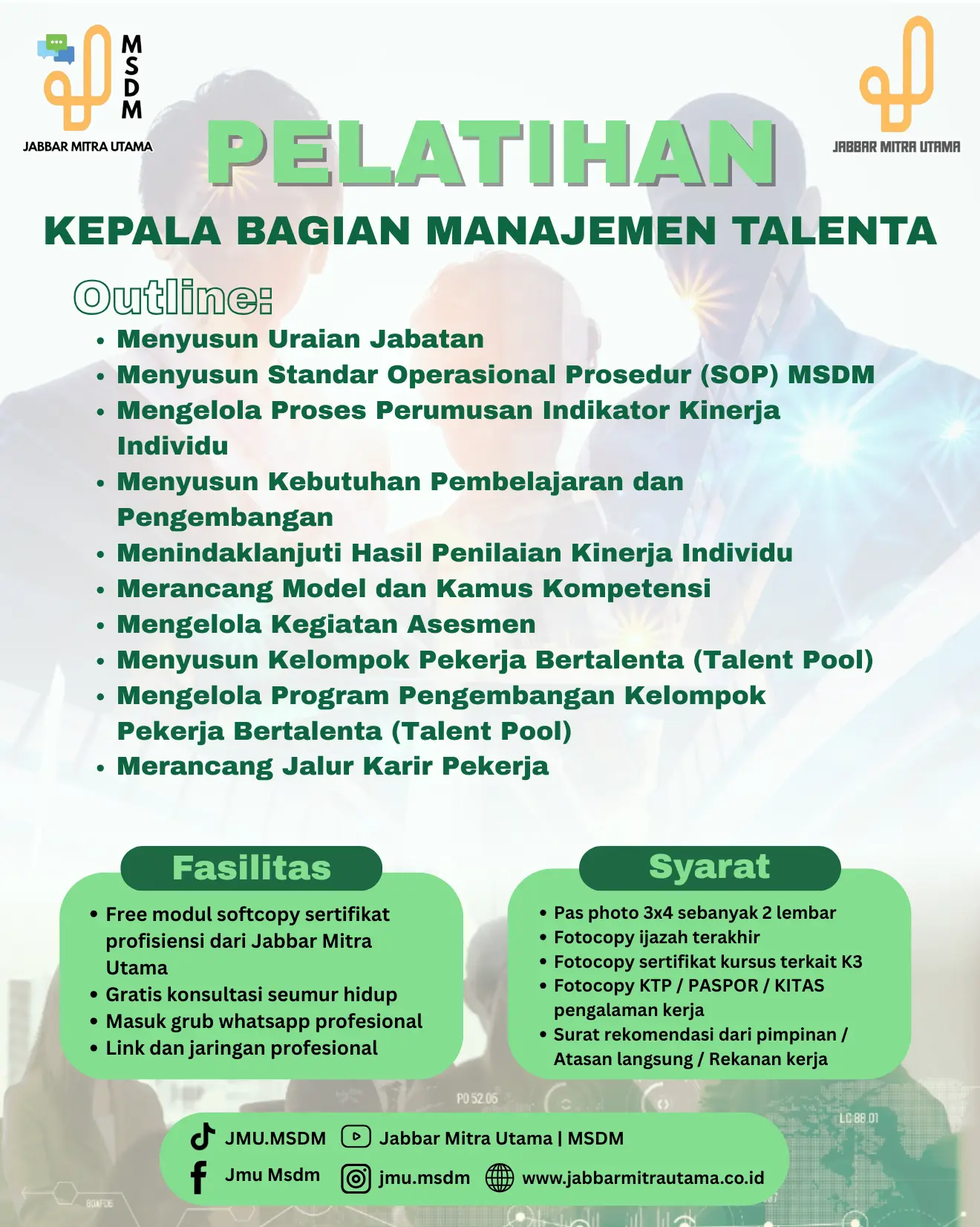 Pelatihan sangat sesuai bagi Anda yang menjabat sebagai Kepala Bagian SDM, HR Specialist, atau profesional yang bertugas dalam perencanaan pengembangan talenta dan jalur karier di perusahaan.