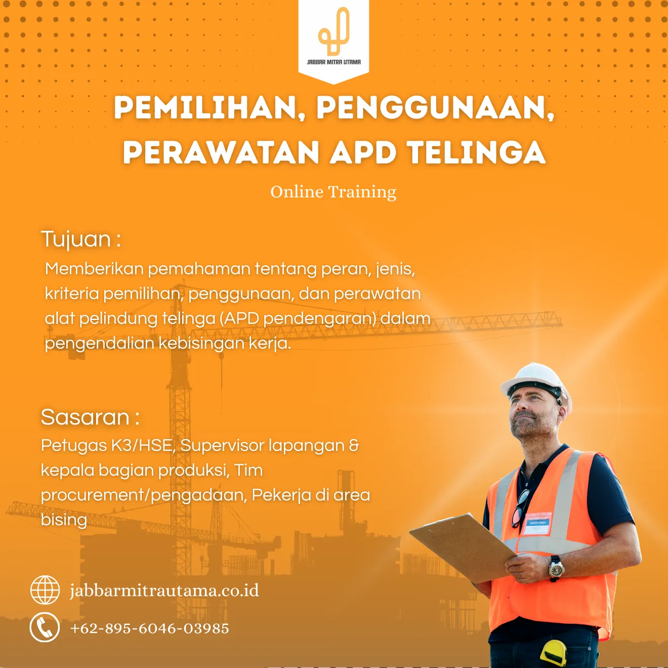 Alat Pelindung Diri (APD) telinga, seperti earplug dan earmuff, merupakan salah satu lapisan penting dalam strategi pengendalian kebisingan kerja. Meskipun APD bukanlah solusi utama, pemilihan, penggunaan, dan perawatan yang tepat dapat sangat efektif dalam mencegah gangguan pendengaran akibat paparan kebisingan di tempat kerja. Pelatihan ini dirancang untuk memberikan pemahaman menyeluruh mengenai jenis-jenis APD telinga, kriteria pemilihan berdasarkan tingkat kebisingan dan kebutuhan pekerja, teknik penggunaan yang benar, serta cara perawatan agar tetap higienis dan fungsional. Dengan penguasaan materi ini, perusahaan dapat memastikan bahwa pekerja tidak hanya terlindungi dari risiko kebisingan, tetapi juga dapat bekerja dengan lebih aman, nyaman, dan produktif.