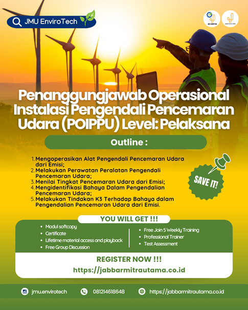 Pelatihan Penanggung Jawab Operasional Instalasi Pengendali Pencemaran Udara (POIPPU) – Level Pelaksana ditujukan untuk personel teknis yang bertanggung jawab dalam pengoperasian, perawatan, dan pemantauan instalasi pengendalian pencemaran udara dari emisi di lingkungan industri.