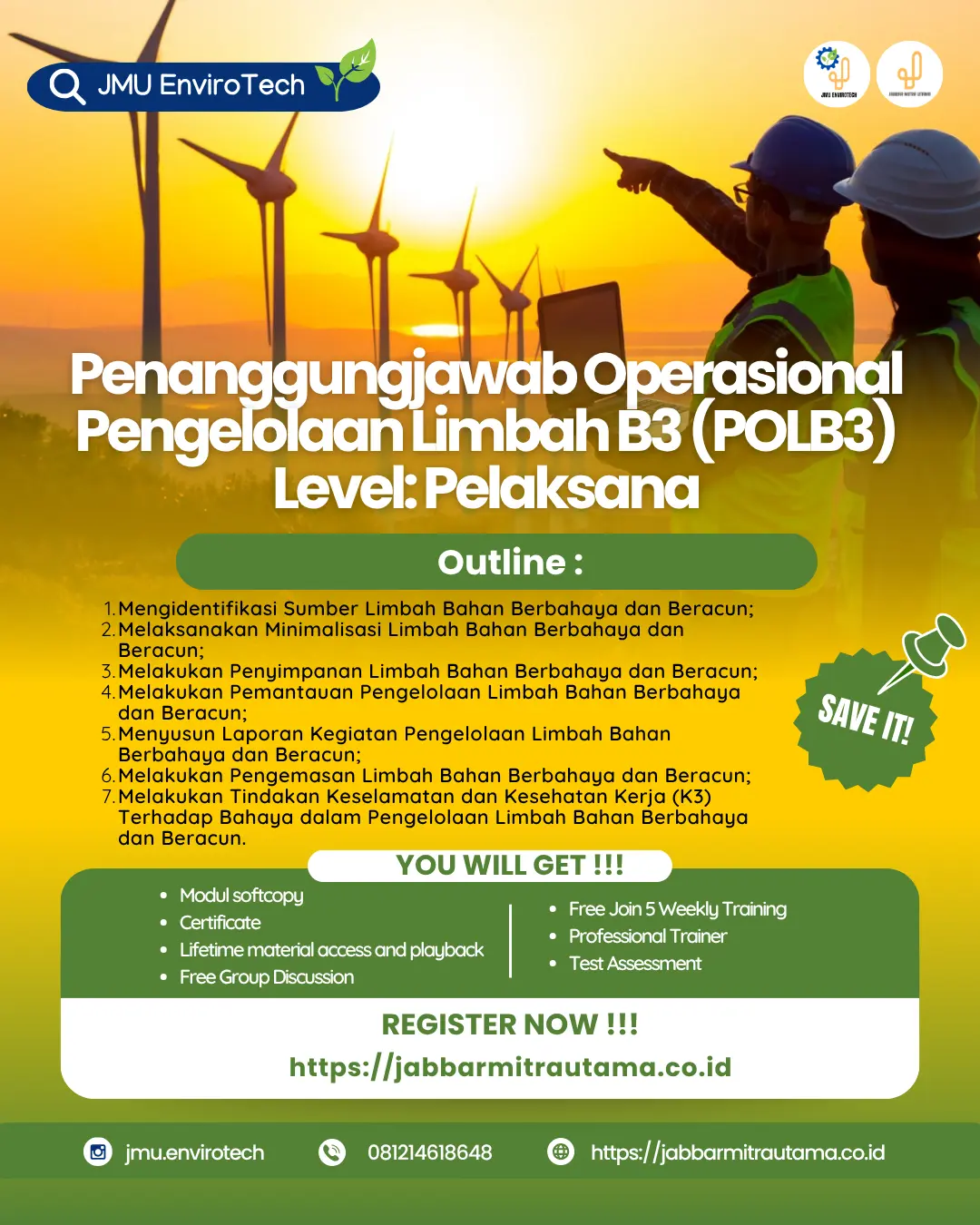 Pelatihan Penanggung Jawab Operasional Pengelolaan Limbah B3 (POLB3) – Level Pelaksana ini ditujukan bagi tenaga teknis atau pelaksana lapangan yang terlibat dalam pengelolaan limbah bahan berbahaya dan beracun (B3). Peserta akan memperoleh pengetahuan dan keterampilan praktis dalam mengidentifikasi sumber limbah B3, melakukan pengurangan limbah dari sumbernya (minimisasi), serta menangani pengumpulan dan penyimpanan limbah B3 sesuai prosedur.