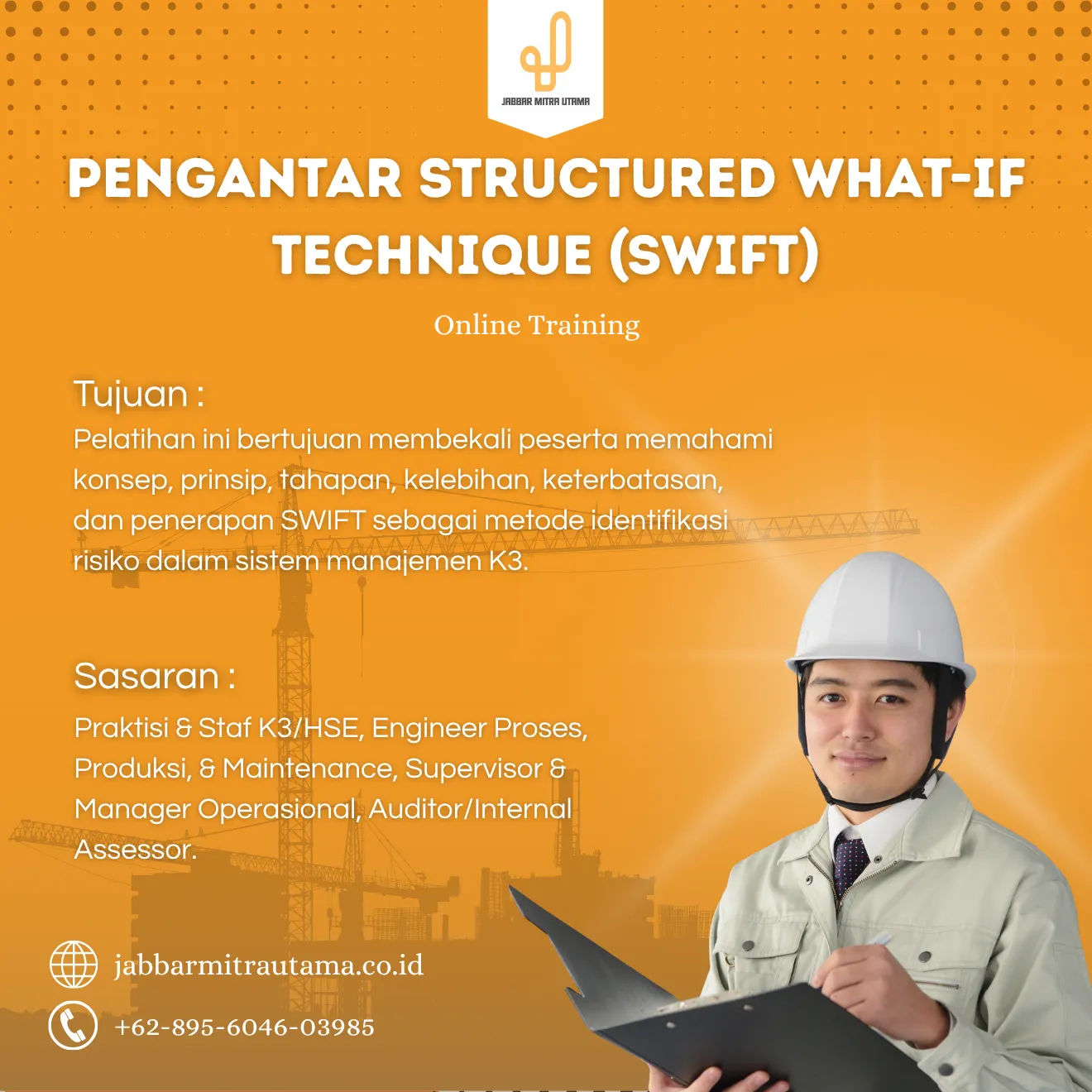 Structured What-If Technique (SWIFT) adalah salah satu metode identifikasi risiko yang sederhana namun sistematis, banyak digunakan dalam manajemen K3 untuk menilai potensi bahaya di berbagai jenis industri. Dengan pendekatan berbasis pertanyaan “what-if”, metode ini membantu tim kerja mengidentifikasi skenario risiko, menilai dampaknya, serta merumuskan langkah mitigasi yang tepat. Melalui pelatihan ini, peserta akan memahami konsep, tahapan, kelebihan, dan keterbatasan SWIFT sehingga mampu menerapkannya secara efektif dalam mendukung budaya keselamatan kerja yang proaktif.