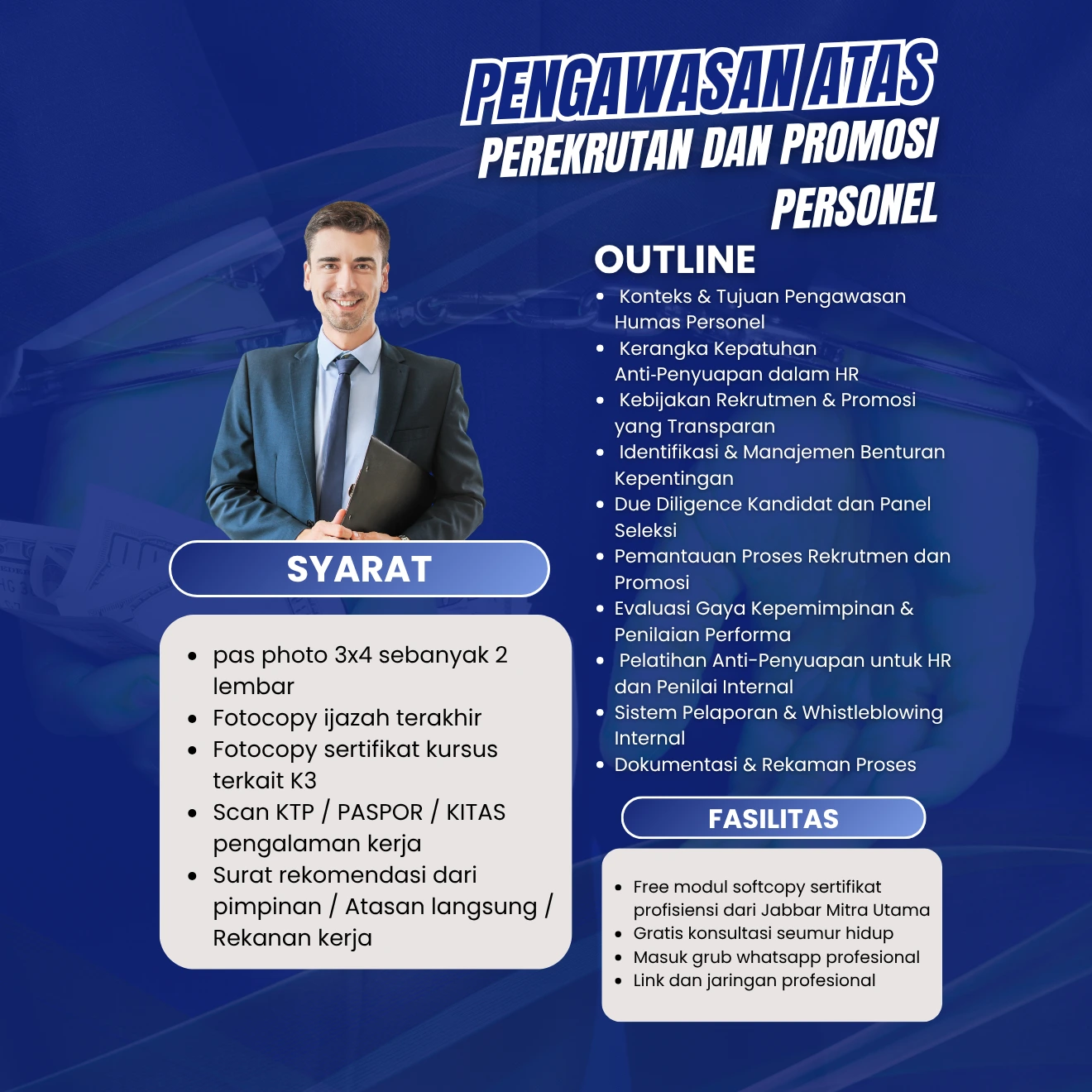 Pelatihan ini dirancang untuk memberikan pemahaman dan keterampilan bagi para profesional SDM, auditor internal, serta pimpinan organisasi dalam menerapkan pengawasan yang efektif atas perekrutan dan promosi personel. Peserta akan mempelajari prinsip-prinsip transparansi, due diligence, manajemen konflik kepentingan, serta penerapan sistem pelaporan internal yang mendukung integritas dan akuntabilitas.