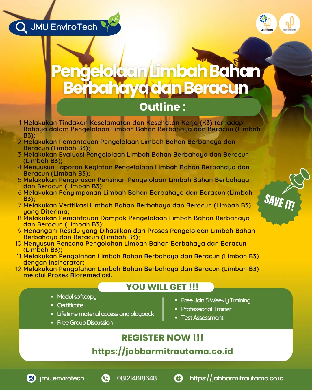 Pelatihan Pengelolaan Limbah Bahan Berbahaya dan Beracun (B3) ditujukan bagi tenaga kerja teknis, pelaksana, maupun pengawas yang terlibat dalam pengelolaan limbah B3 di berbagai sektor industri. Pelatihan ini akan memberikan pemahaman komprehensif terkait langkah-langkah teknis, administratif, dan keselamatan kerja dalam menangani limbah B3 secara aman, legal, dan ramah lingkungan.