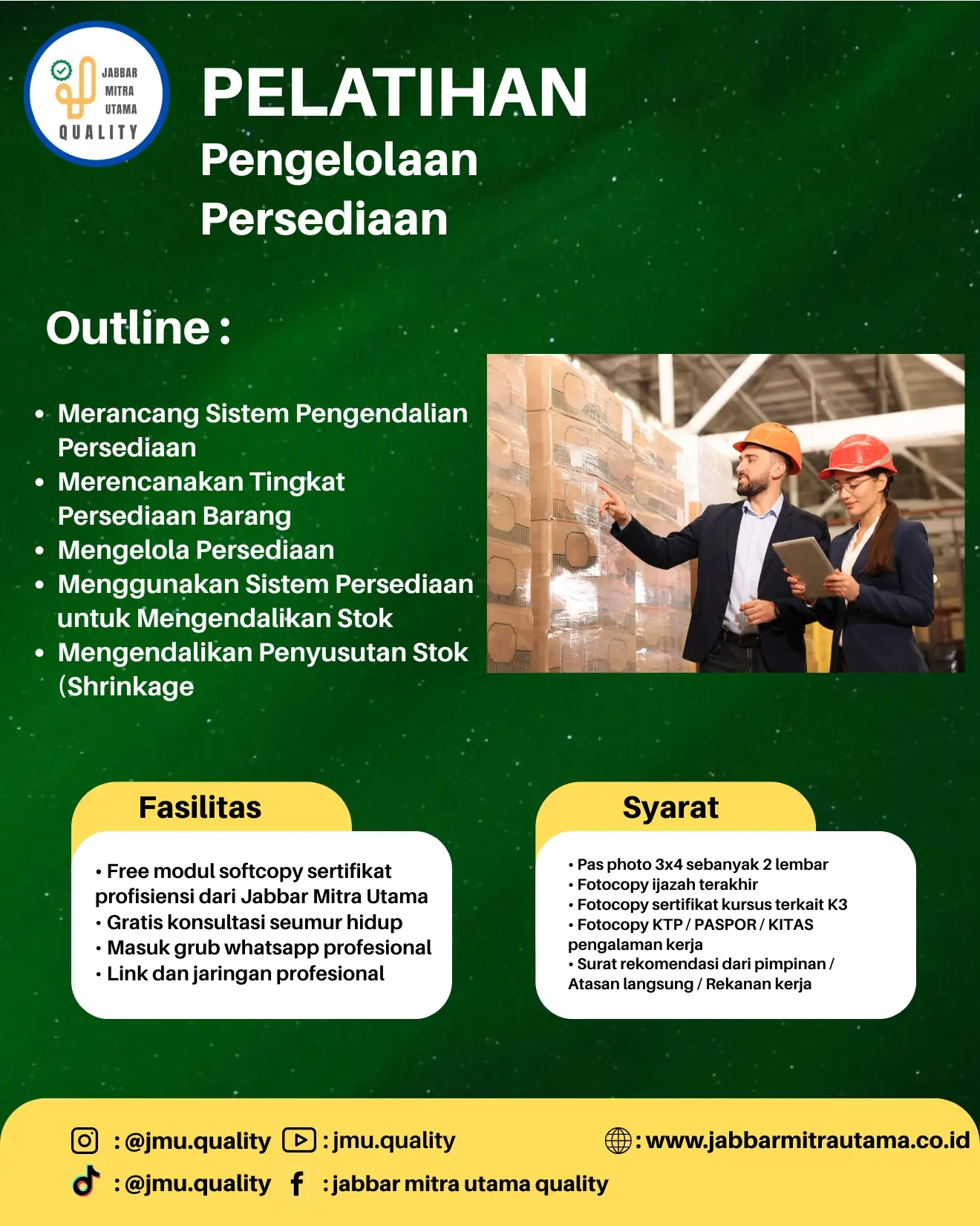 Pelatihan Pengelolaan Persediaan ini dirancang khusus untuk memberikan pemahaman mendalam kepada peserta tentang pentingnya sistem manajemen persediaan yang efisien dan efektif dalam rantai pasok perusahaan. Dengan materi yang aplikatif dan berbasis praktik terbaik industri, pelatihan ini akan membantu peserta dalam merancang, merencanakan, serta mengendalikan persediaan barang agar operasional bisnis tetap optimal dan hemat biaya.