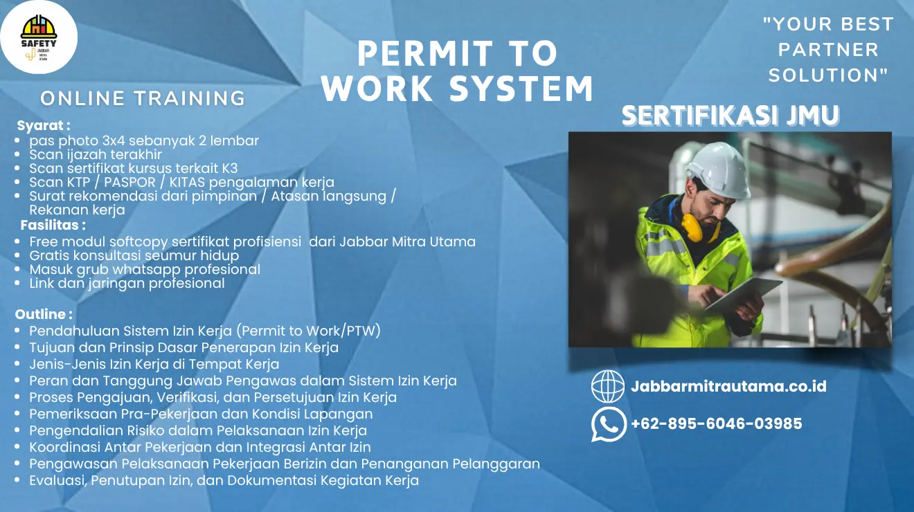 Pelatihan Permit to Work System (PTW) ini dirancang untuk memberikan pemahaman komprehensif tentang sistem izin kerja sebagai salah satu instrumen penting dalam penerapan Keselamatan dan Kesehatan Kerja (K3). Melalui pelatihan ini, peserta akan mempelajari dasar-dasar sistem izin kerja, jenis-jenis izin kerja, serta prinsip dan prosedur pelaksanaannya agar setiap kegiatan berisiko tinggi dapat dikendalikan dengan aman.