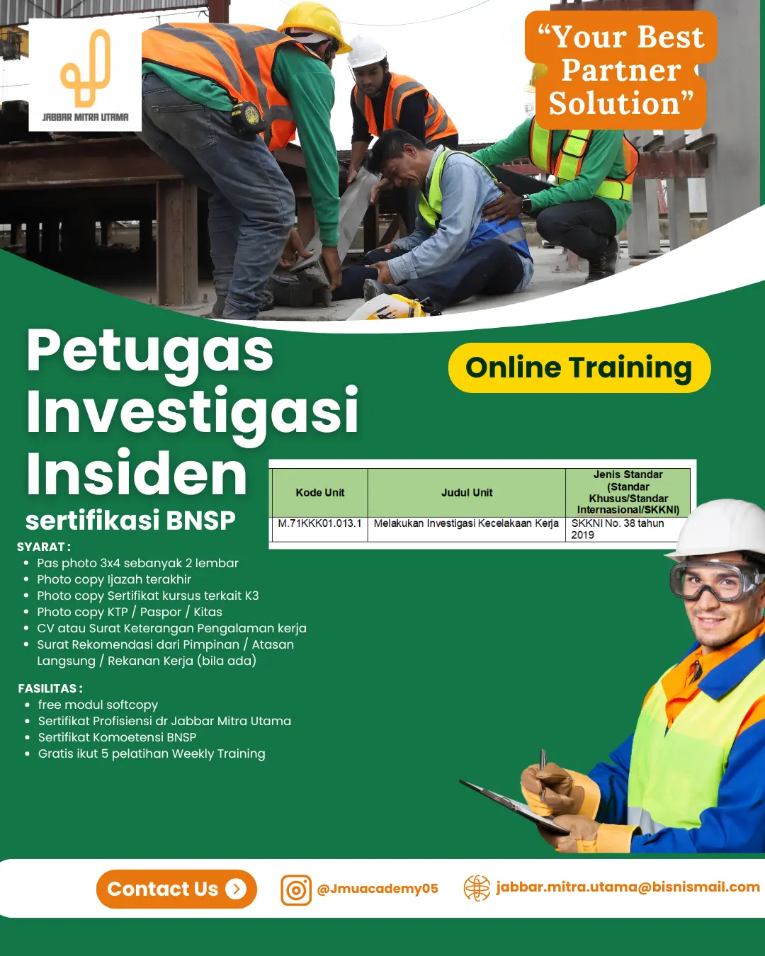 Pelatihan Petugas Investigasi Insiden ini bertujuan untuk meningkatkan kompetensi peserta dalam melakukan investigasi kecelakaan kerja secara profesional dan sesuai dengan standar nasional. Peserta akan dibekali dengan keterampilan teknis dan metodologis untuk mengidentifikasi penyebab insiden, mengumpulkan bukti secara sistematis, serta menyusun laporan investigasi yang objektif dan dapat dipertanggung jawabkan.